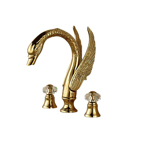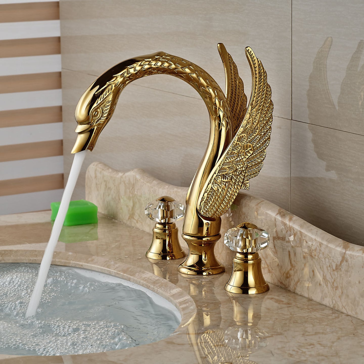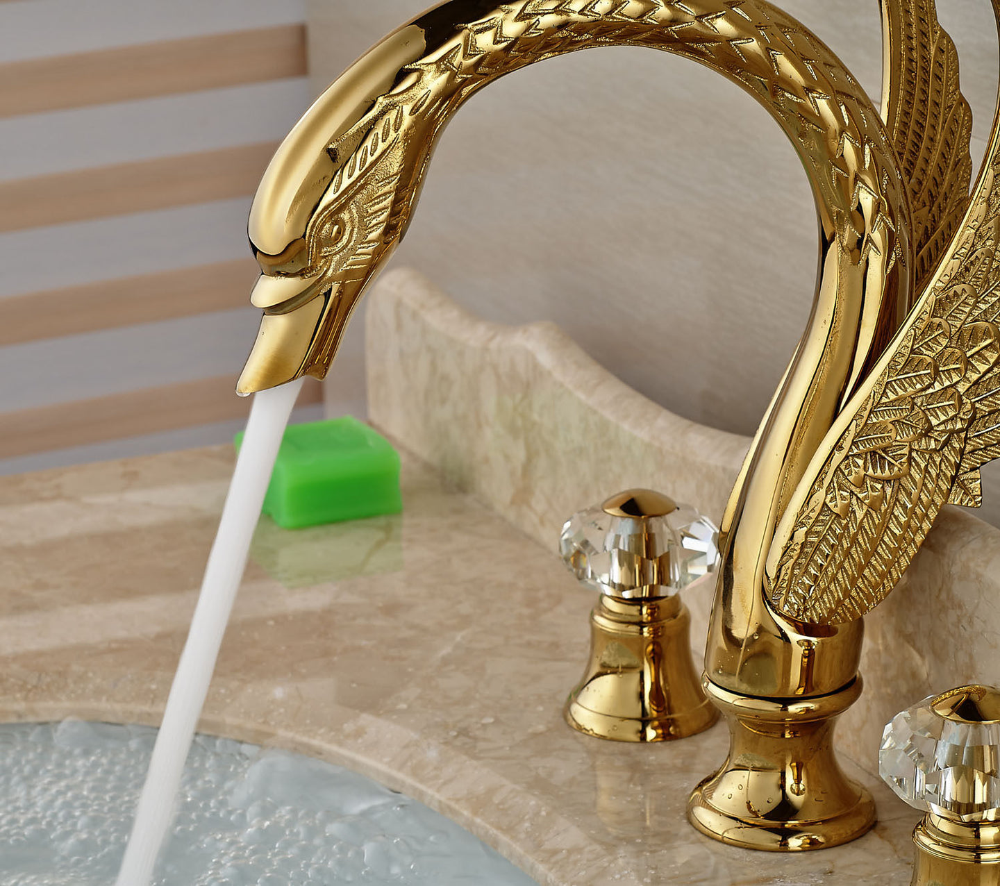 Dieser goldene Waschtischhahn in Form eines eleganten Schwans verfügt über 2 Bedienknöpfe.