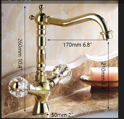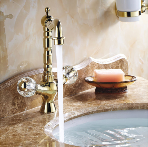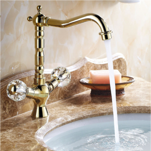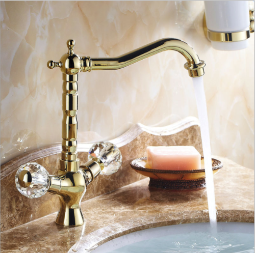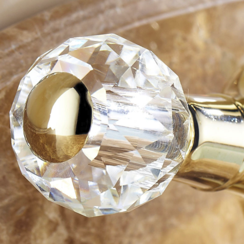 Eleganter goldener Wasserhahn mit wunderschönen Bedienhebeln in Kristalloptik.