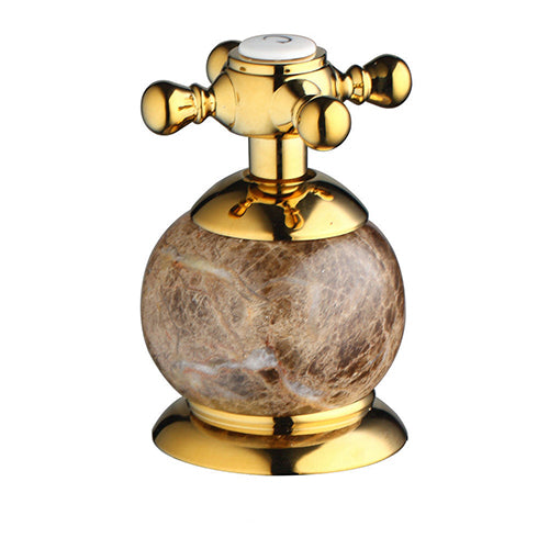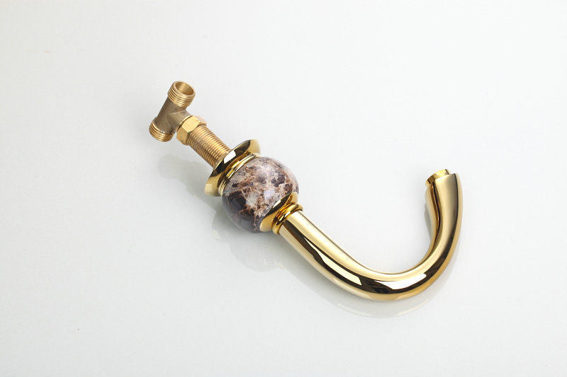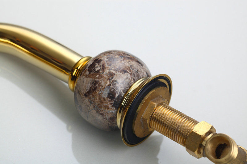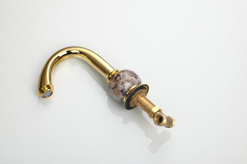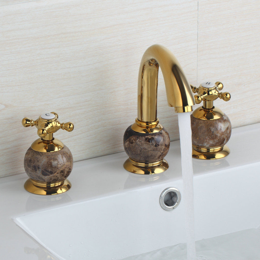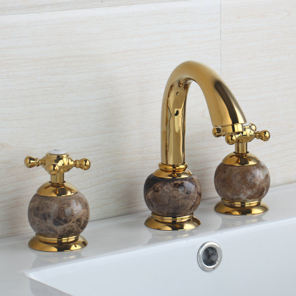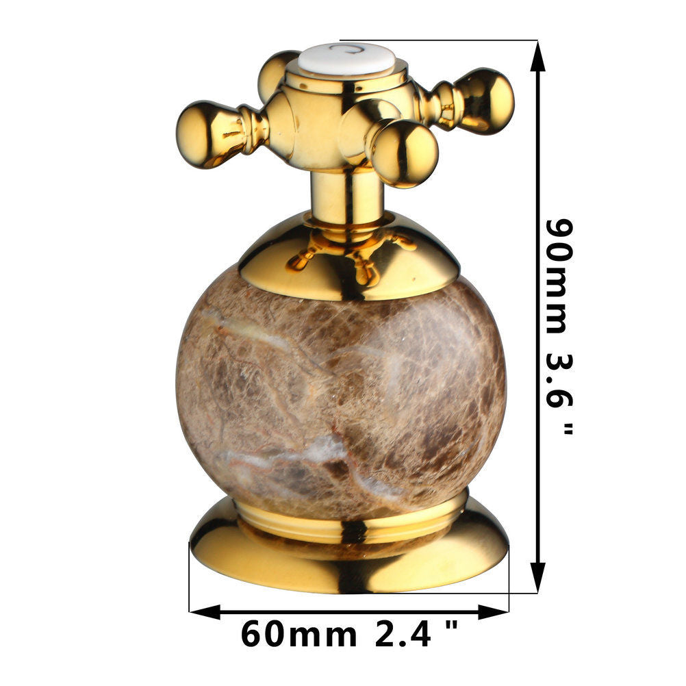 Wunderschöner, eleganter, stilvoller, vergoldeter, dreiteiliger Badewannenhahn mit goldenen Chromakzenten und einer Keramikbasis in Marmoroptik.