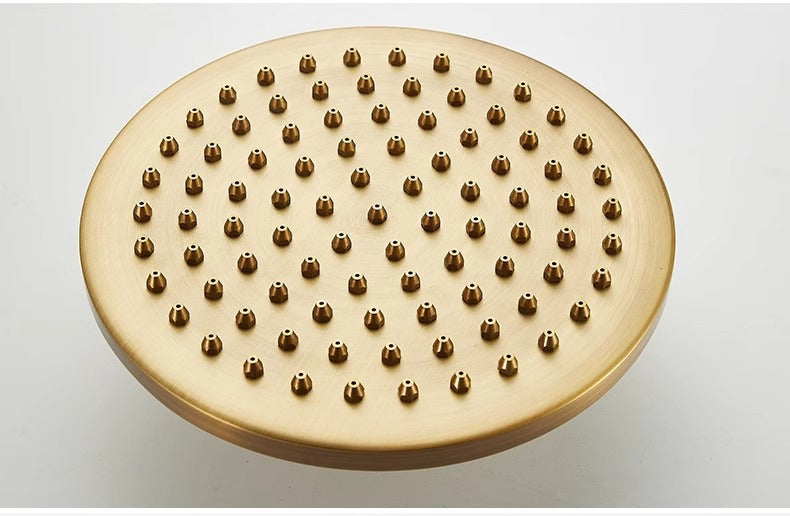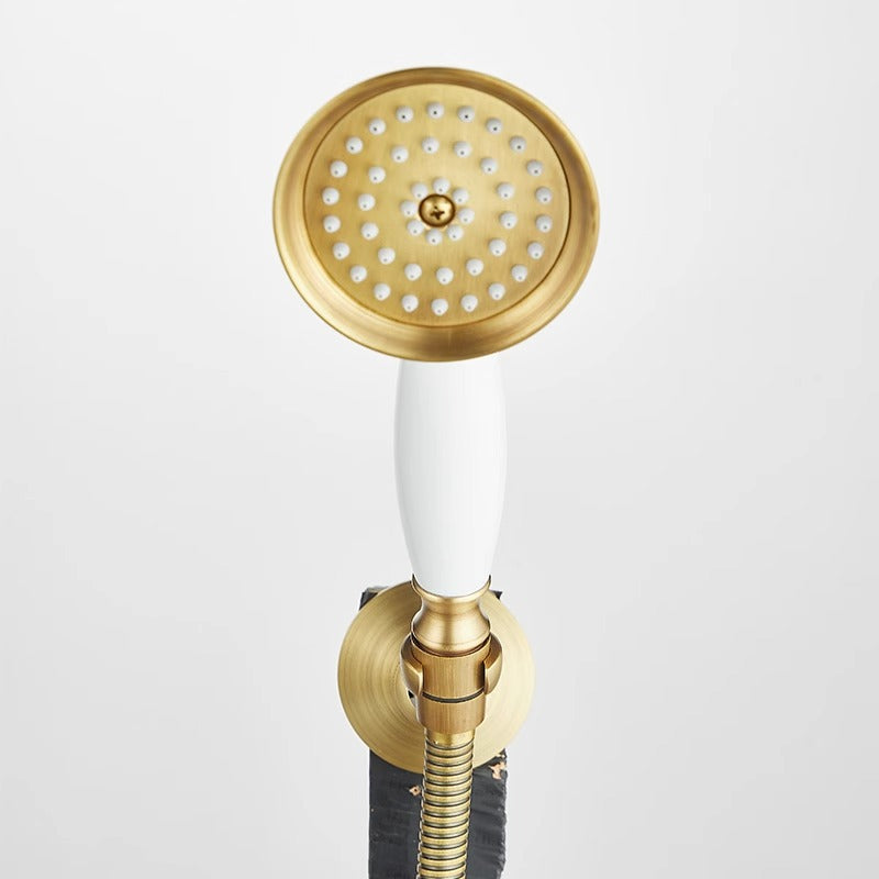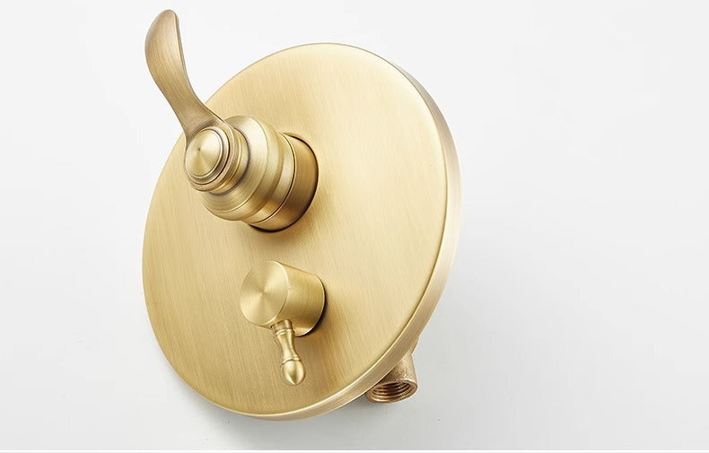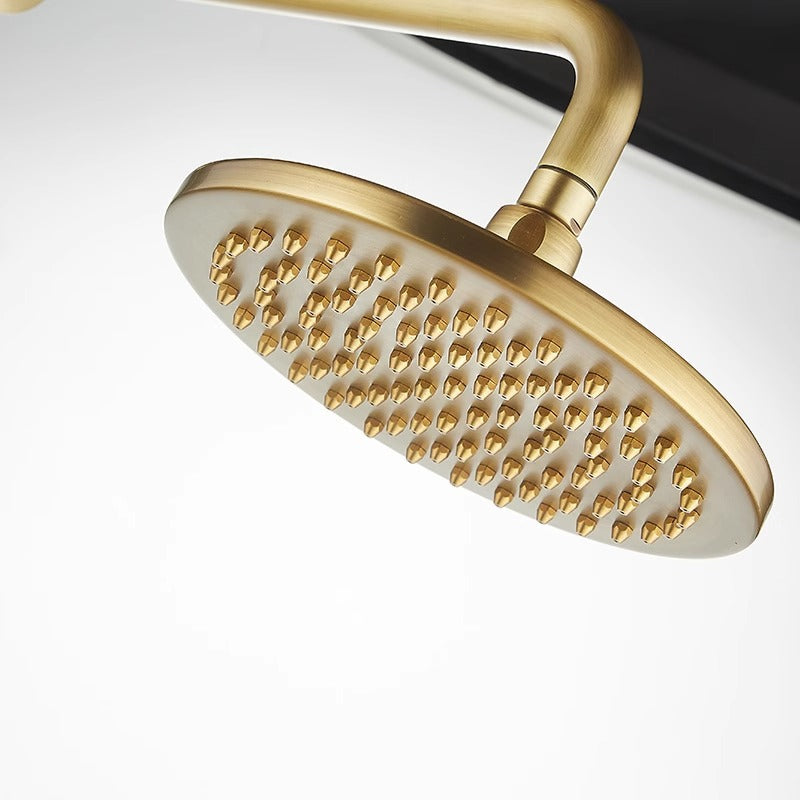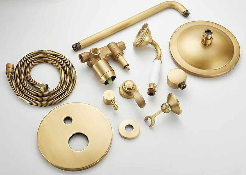 - Hauptmerkmale: Massives Messing, Bronze-Finish, eingebauter Mischer mit Umsteller (Kopfbrause/Handbrause), runder Regenduschkopf, Keramikkartusche, Wandmontage