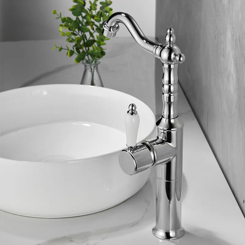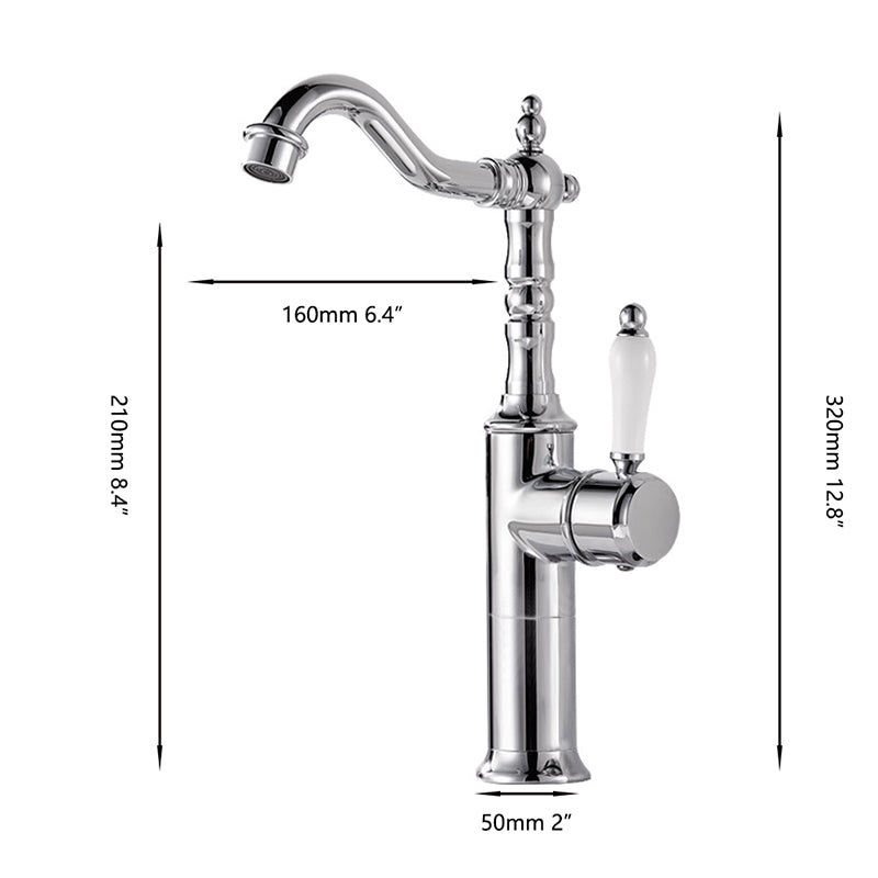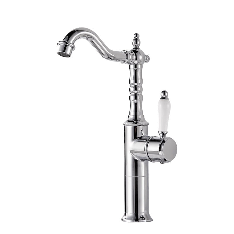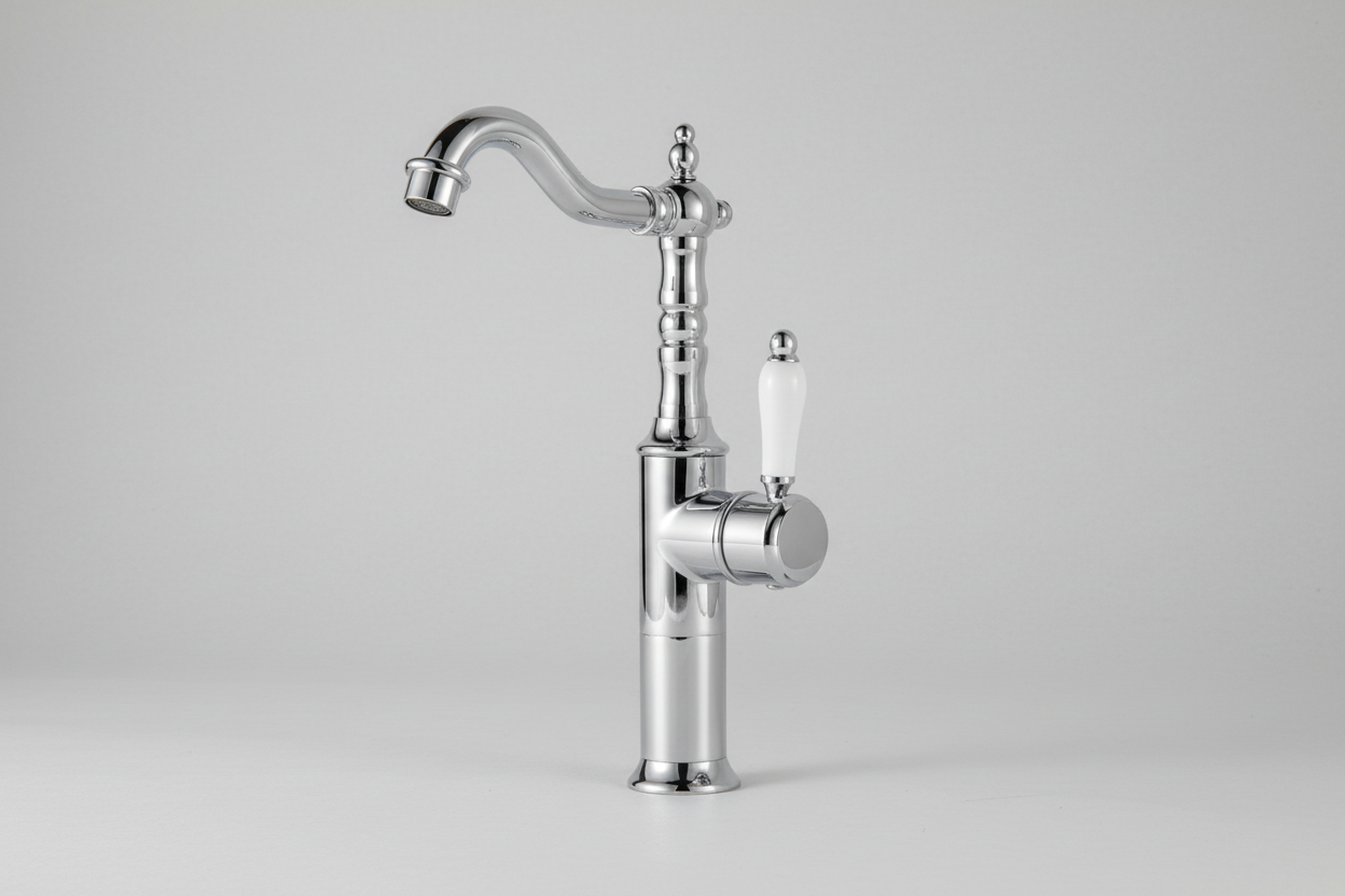 Deze landelijke wastafelkraan in chroom geeft de badkamer een elegante en nostalgische uitstraling. Het klassieke ontwerp met sierlijke vormen en porseleinen hendel past perfect in landelijke, klassieke en tijdloze badkamers.