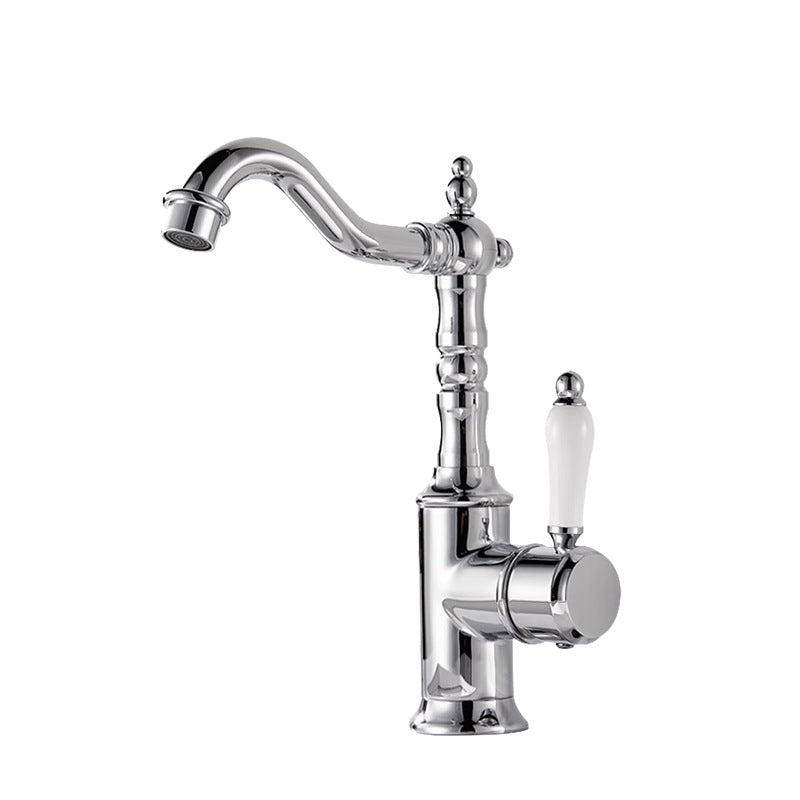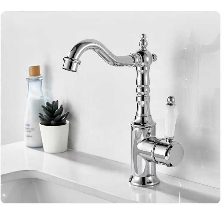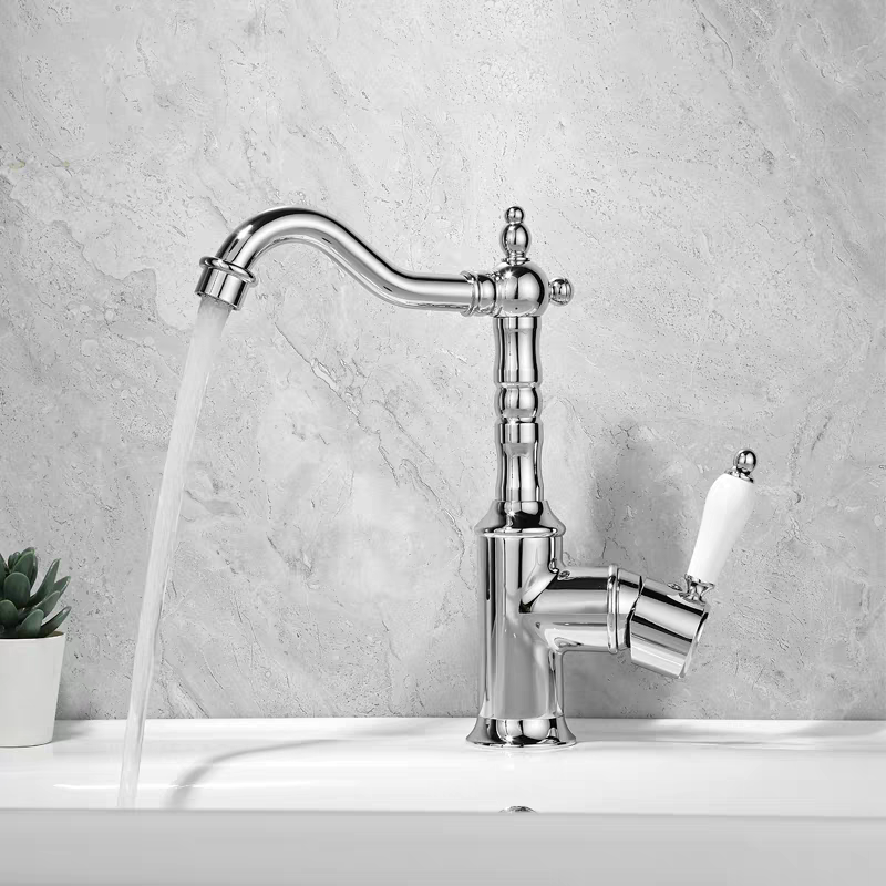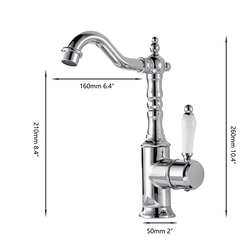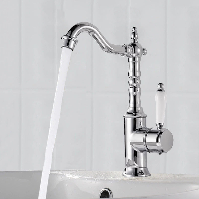 Deze landelijke wastafelkraan in chroom combineert een klassiek nostalgisch ontwerp met moderne betrouwbaarheid. De sierlijke vormen, porseleinen hendel en elegante uitloop geven de kraan een tijdloze uitstraling die perfect past in landelijke en klassieke badkamers.