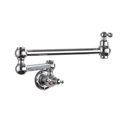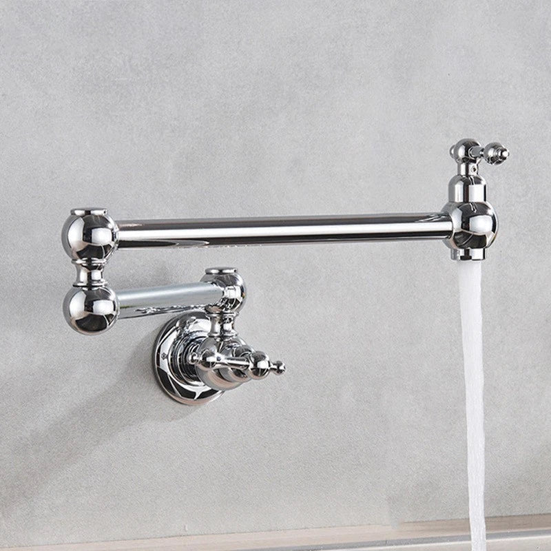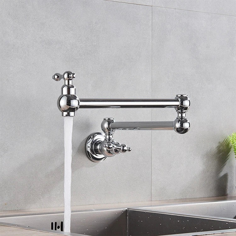 Verleihen Sie Ihrer Küche oder Ihrem Hauswirtschaftsraum mit diesem Wandhahn aus poliertem Chrom klassischen Charme. Das Doppelschwenkdesign bietet maximale Bewegungsfreiheit über dem Herd oder der geräumigen Spüle, während die massive Messingkonstruktion für langlebige Zuverlässigkeit sorgt.