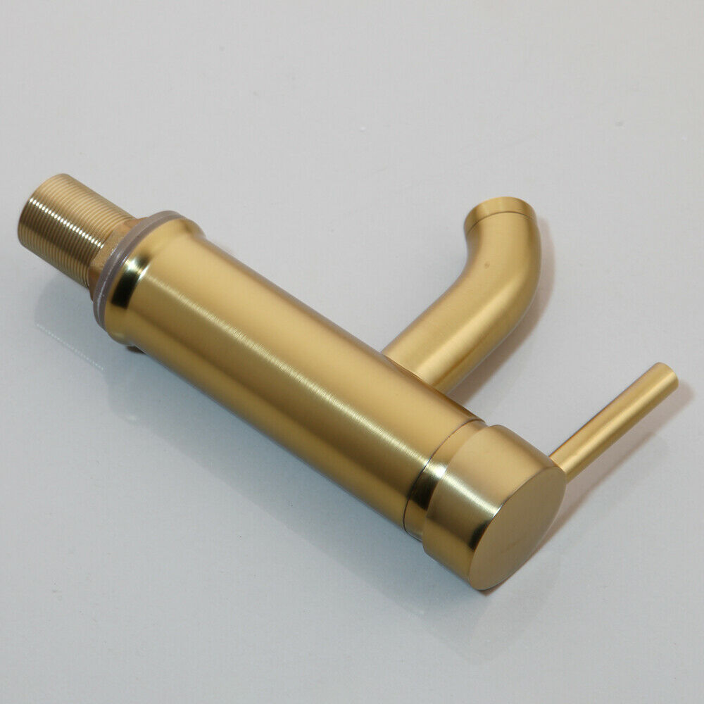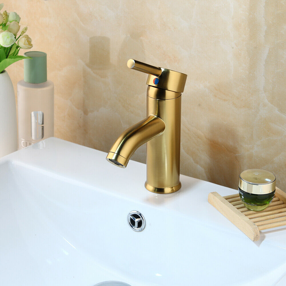 Die gebürstete Goldoptik verleiht diesem Waschtischarmaturmodell ein luxuriöses Aussehen.