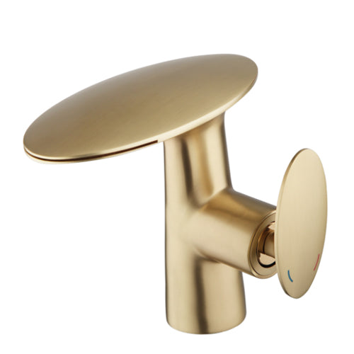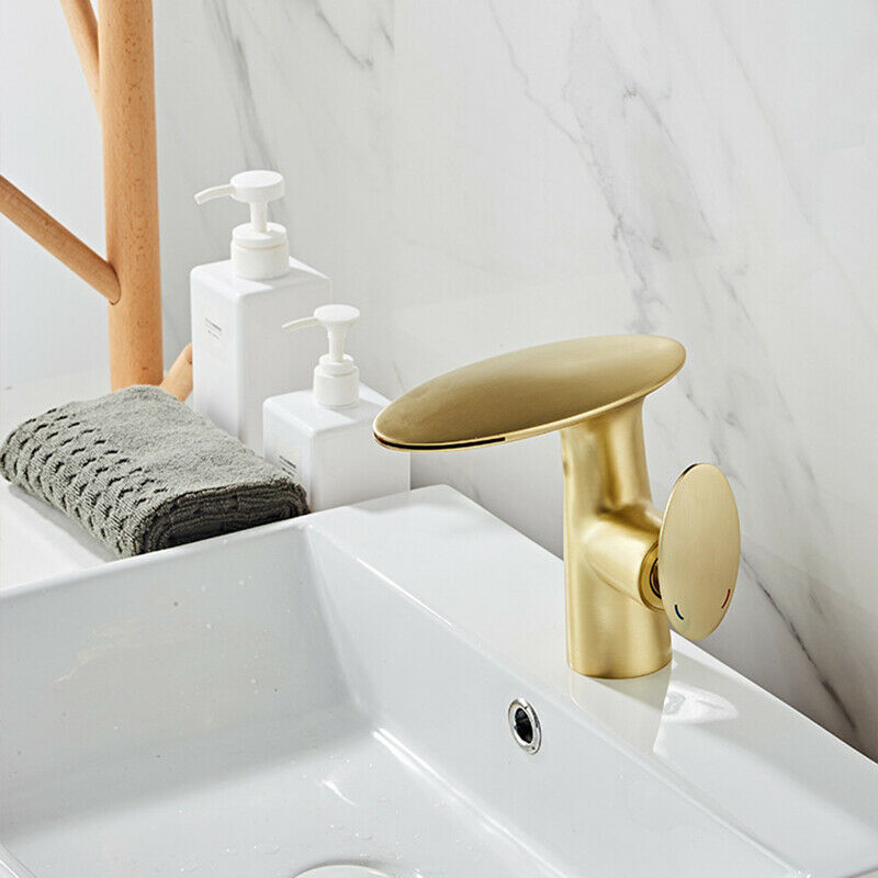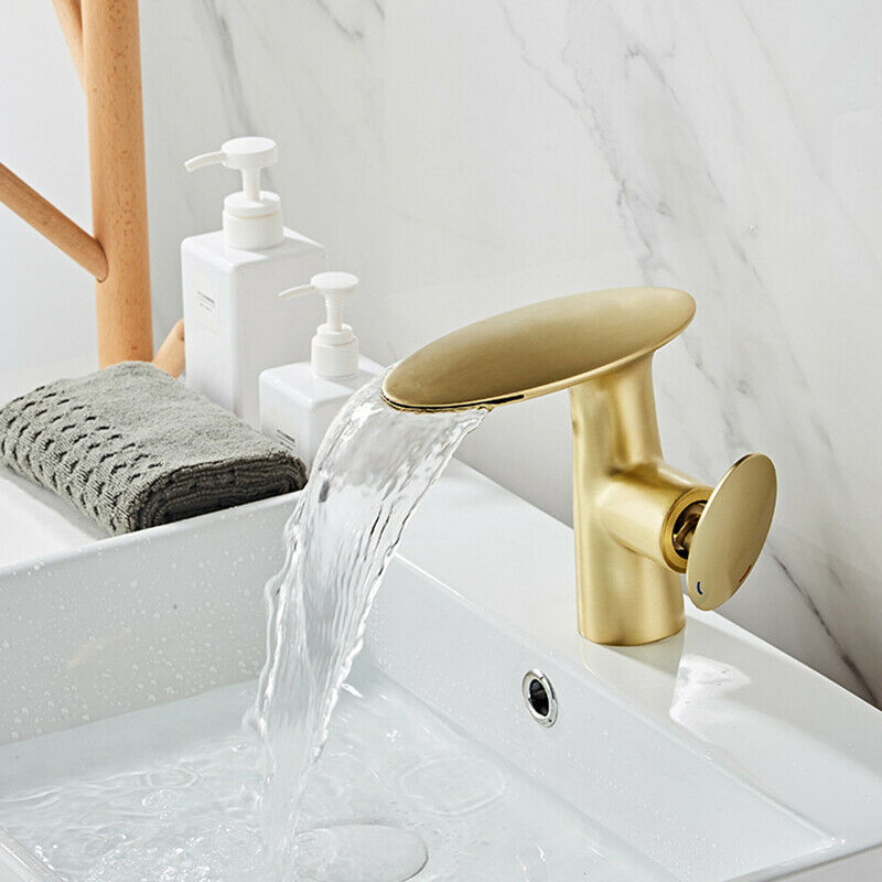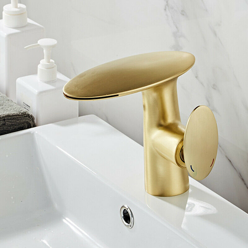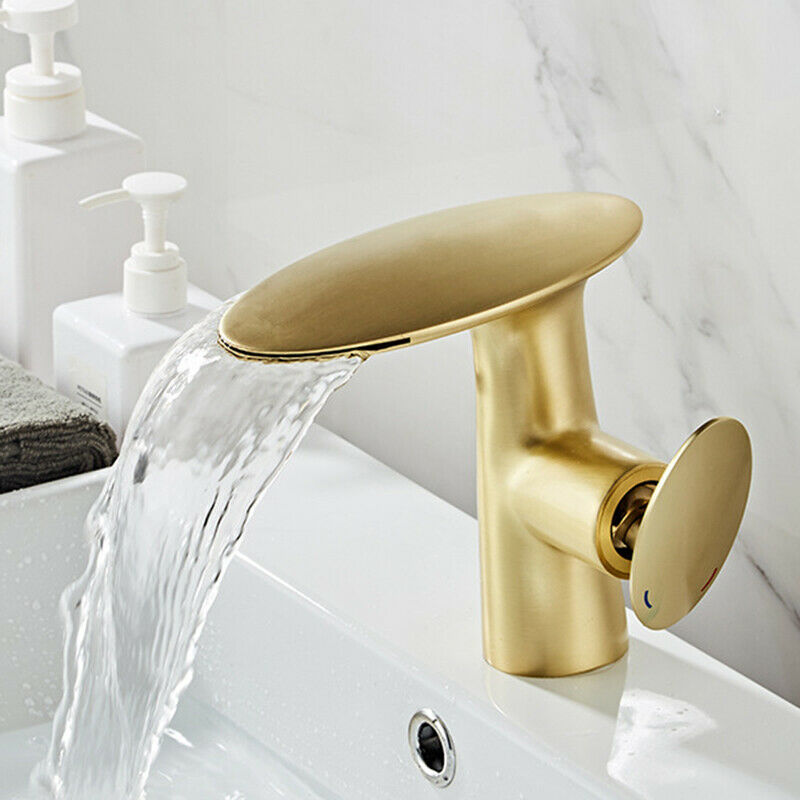 Wunderschöner Wasserfallhahn aus gebürstetem Gold mit breitem Auslauf.