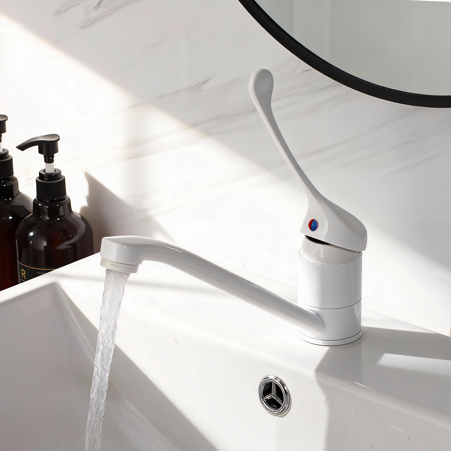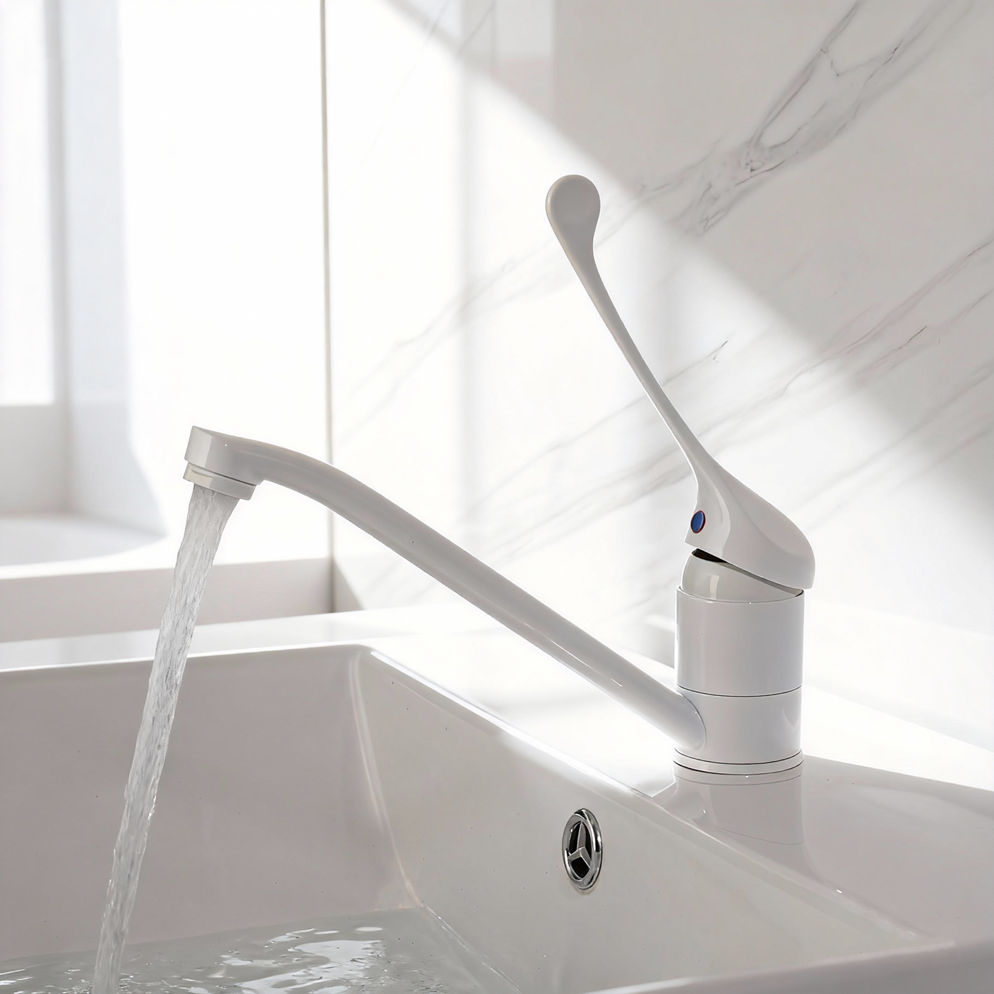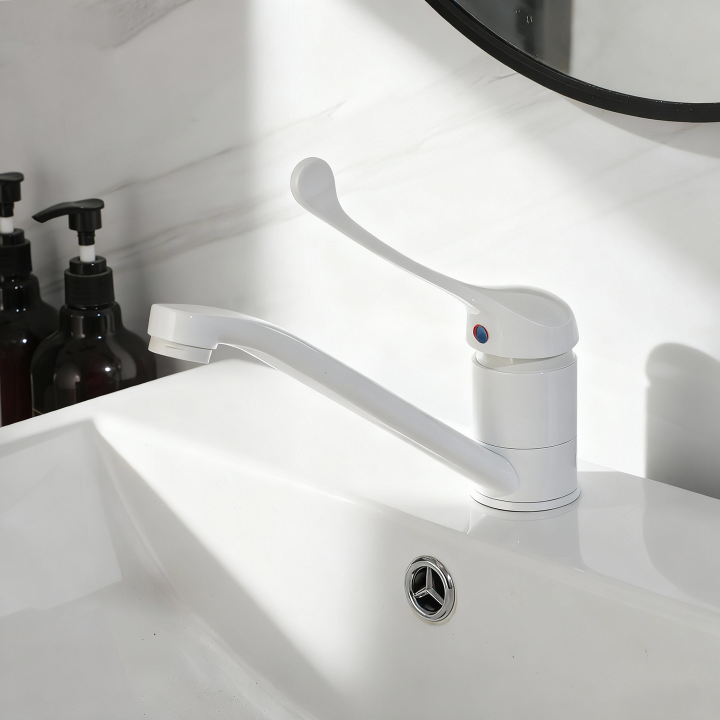 Deze medische mengkraan met verlengde elleboogbediening is speciaal ontworpen voor situaties waar hygiëne en handsfree bediening belangrijk zijn, zoals zorginstellingen, tandartspraktijken, horeca en werkplaatsen. De kraan heeft een duurzame witte afwerking en een soepel bedienbare hendel voor nauwkeurige temperatuur- en waterregeling.