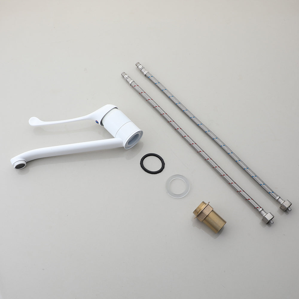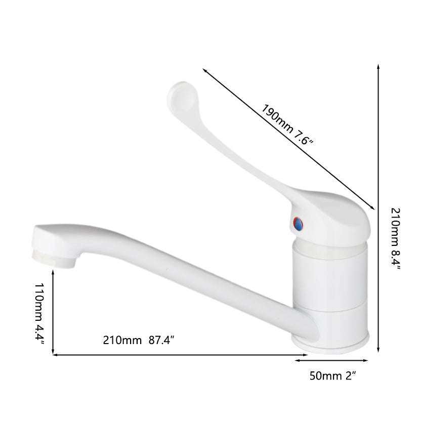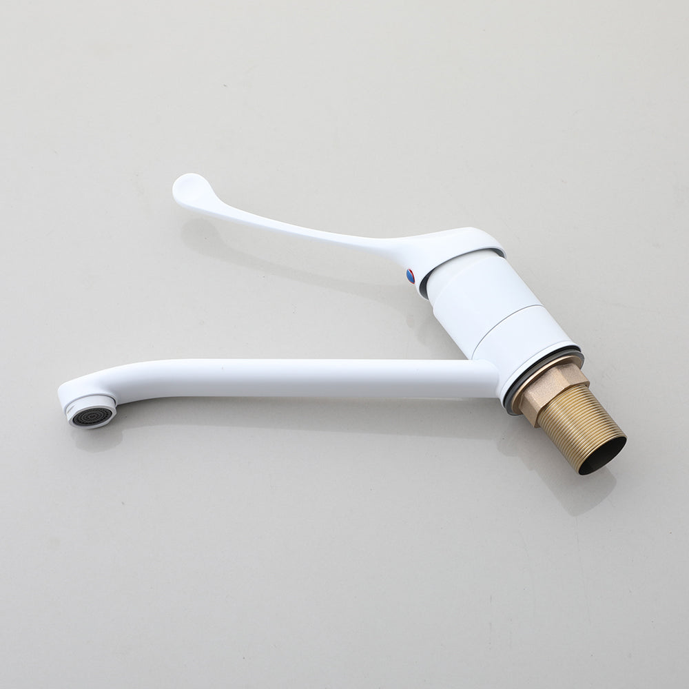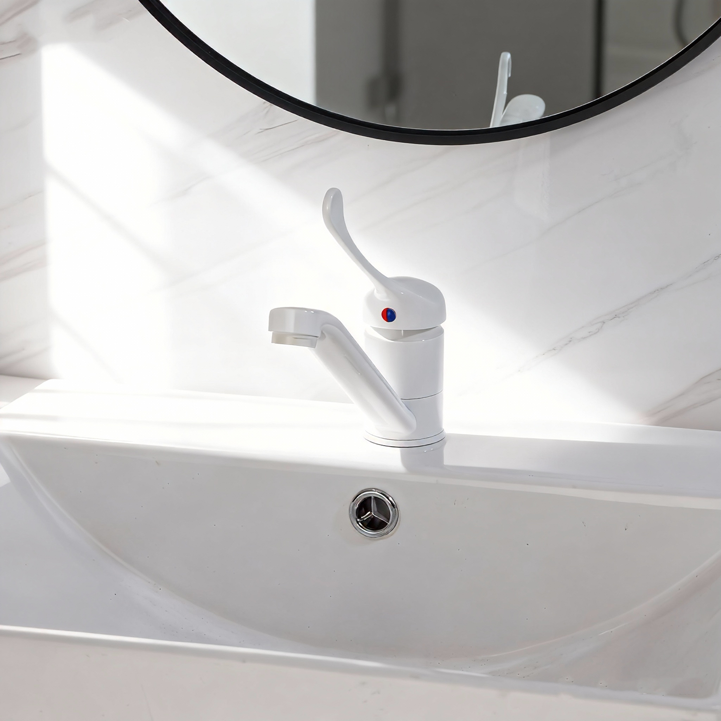 Deze medische mengkraan met verlengde elleboogbediening is speciaal ontworpen voor situaties waar hygiëne en handsfree bediening belangrijk zijn, zoals zorginstellingen, tandartspraktijken, horeca en werkplaatsen. De kraan heeft een duurzame witte afwerking en een soepel bedienbare hendel voor nauwkeurige temperatuur- en waterregeling.