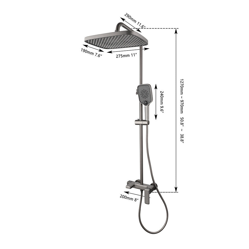 - Gesamthöhe der Gun Metal Regendusche: 970-1270 MM (das Set kann zusammengedrückt werden, sodass es kürzer/weniger hoch ist)