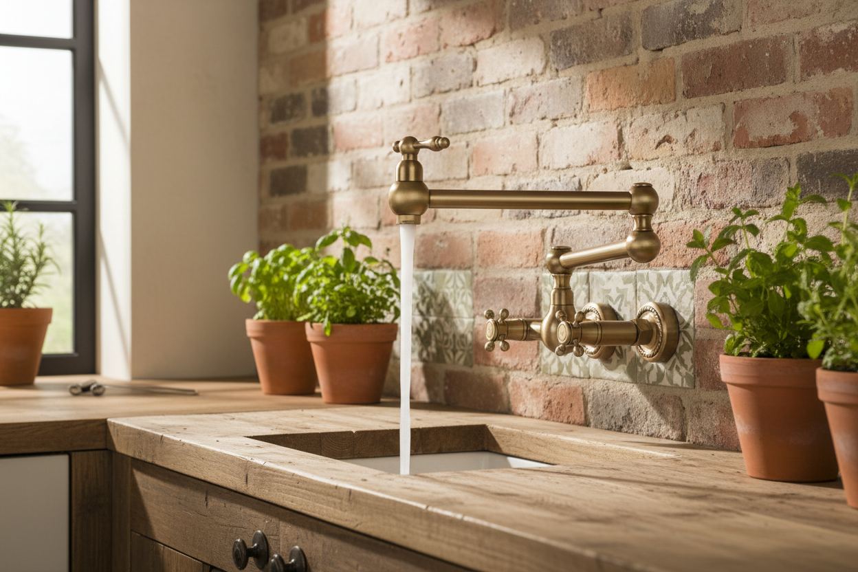 Dieser bronzene Wandhahn verleiht Ihrem Badezimmer oder Ihrer Küche sofort einen warmen, rustikalen Look. Das klassische Design mit Kreuzgriffen und einem Auslauf mit Doppelgelenk verbindet Charme mit Funktionalität.