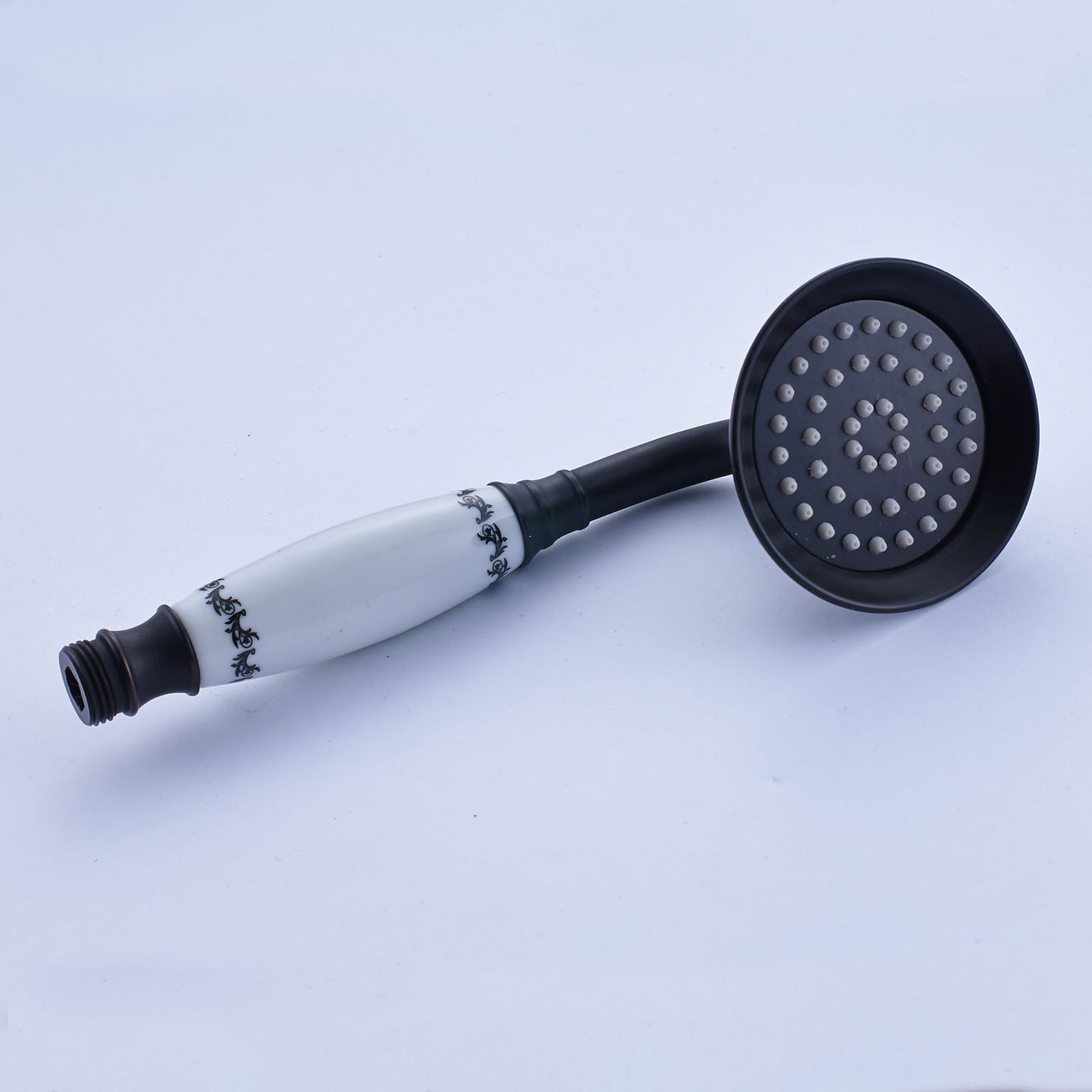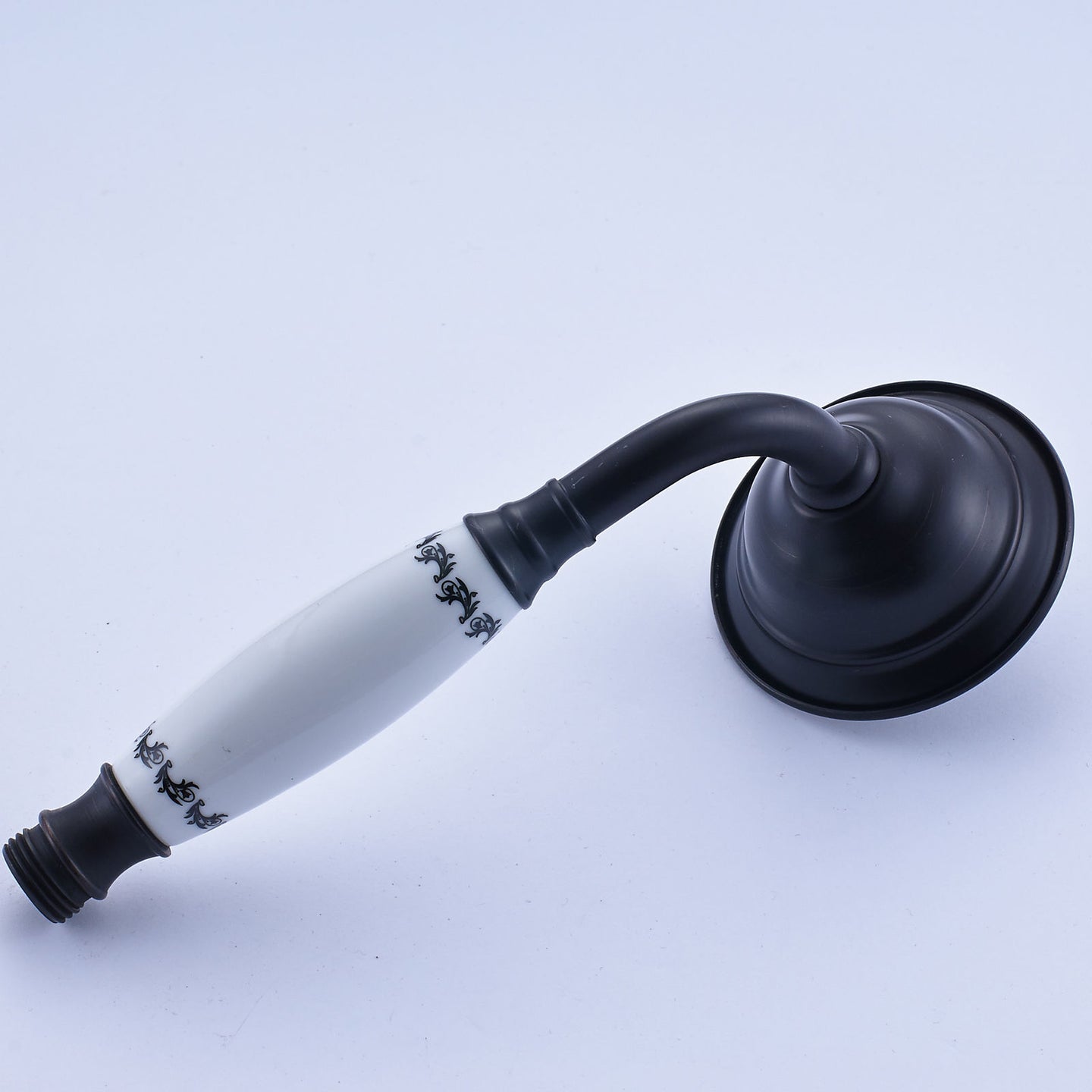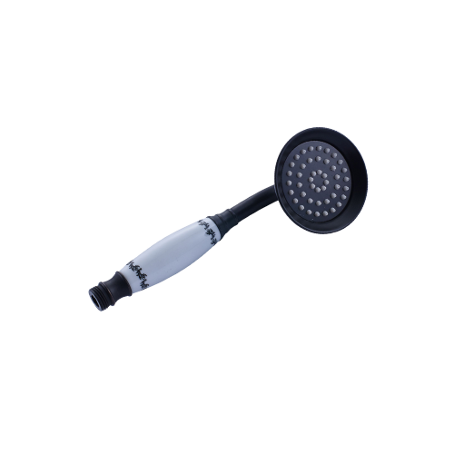 Diese nostalgische Handbrause ist aus Messing gefertigt und hat einen weißen Griff.