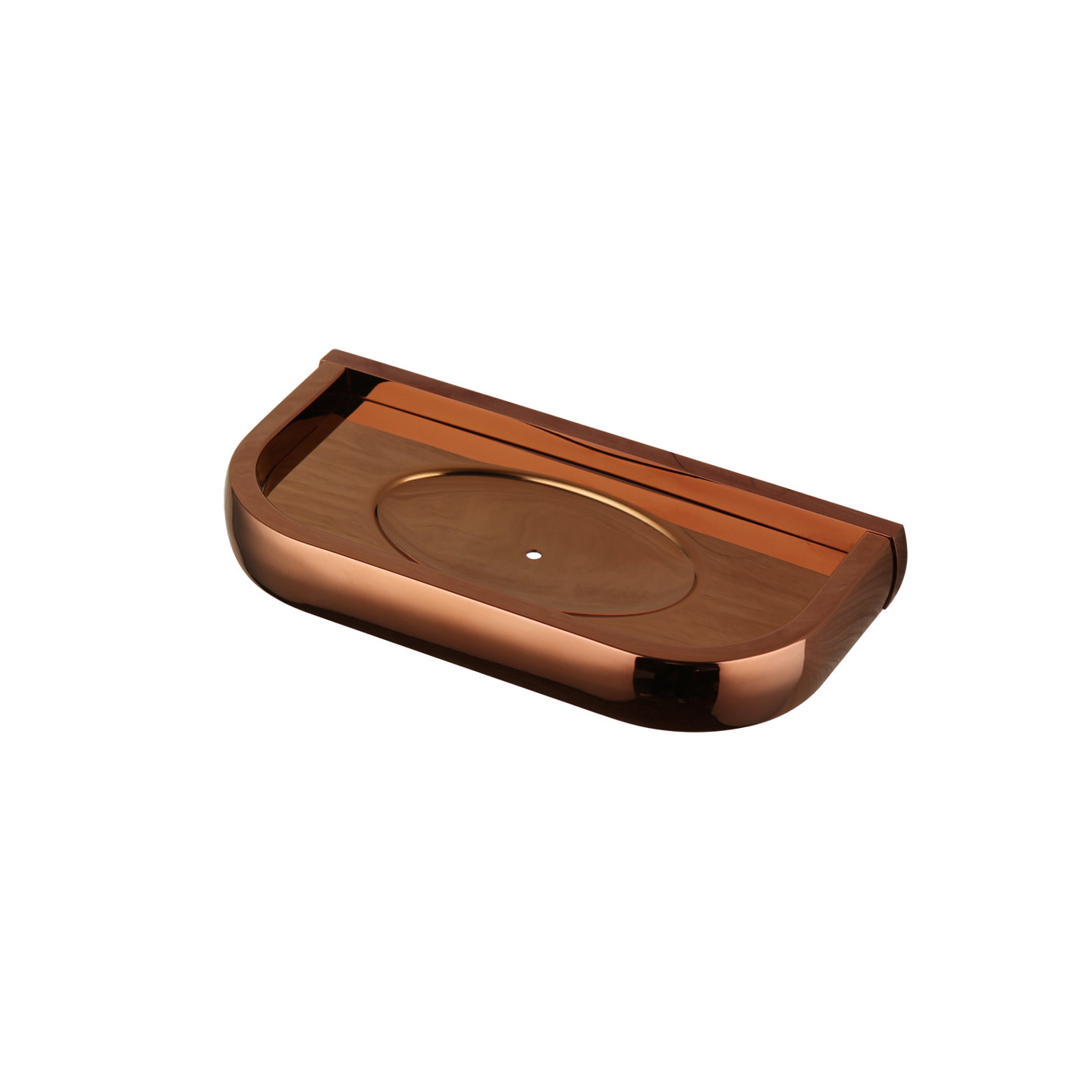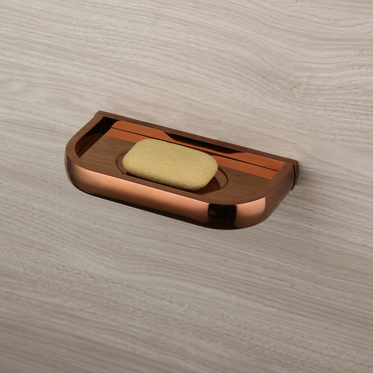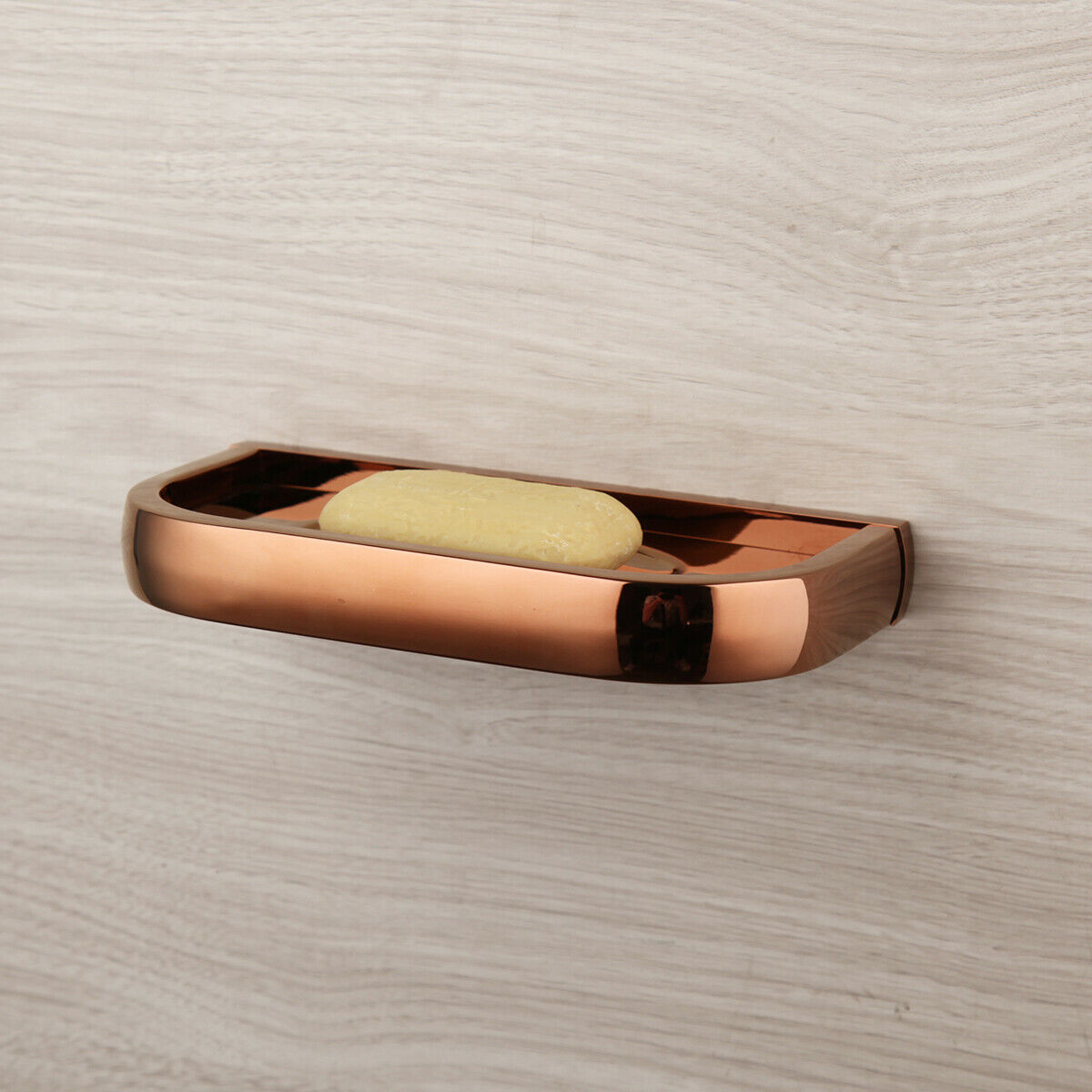 Der Seifenhalter besteht aus Edelstahl mit poliertem Roségold-Finish.