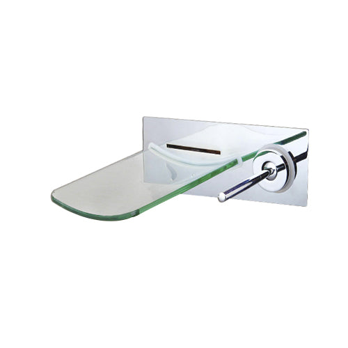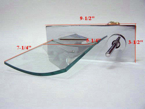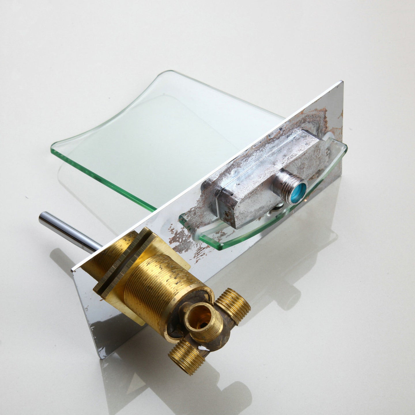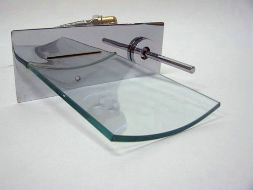 Der eingebaute Wasserfallhahn hat eine Öffnung aus gehärtetem Glas und eine verchromte Rückplatte.
