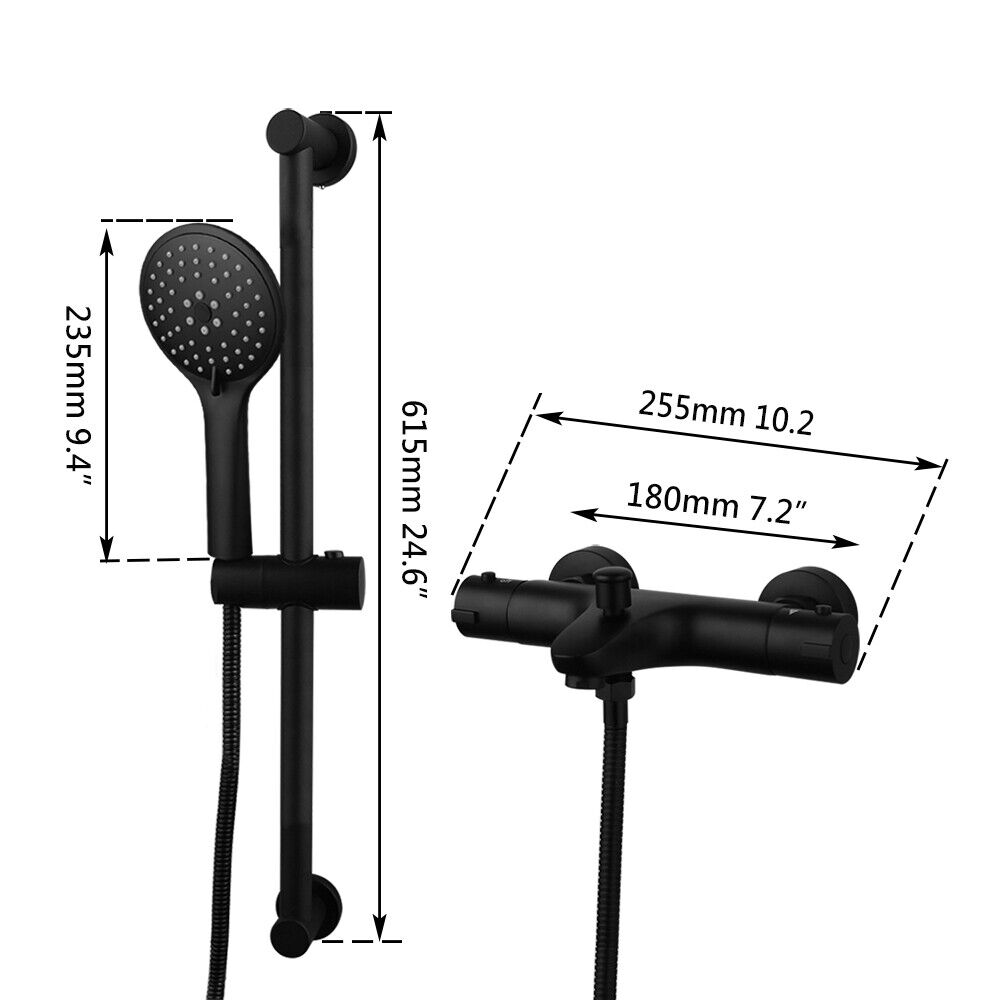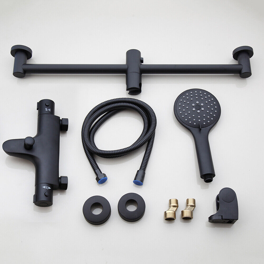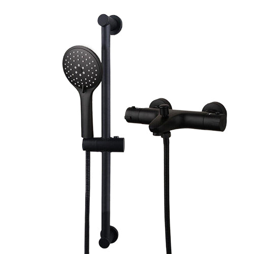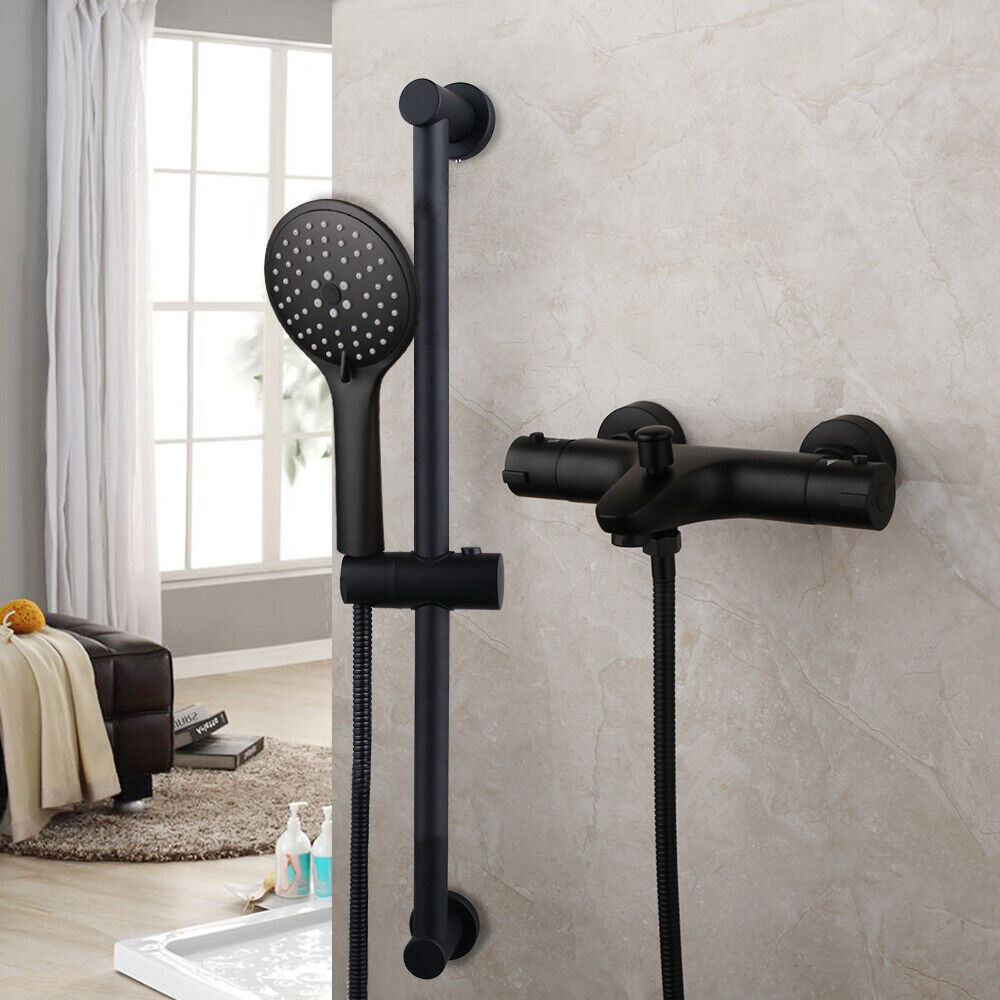 Schwarzer Thermostat-Badewannenhahn mit Gleitstange und 3-Positionen-Handbrause