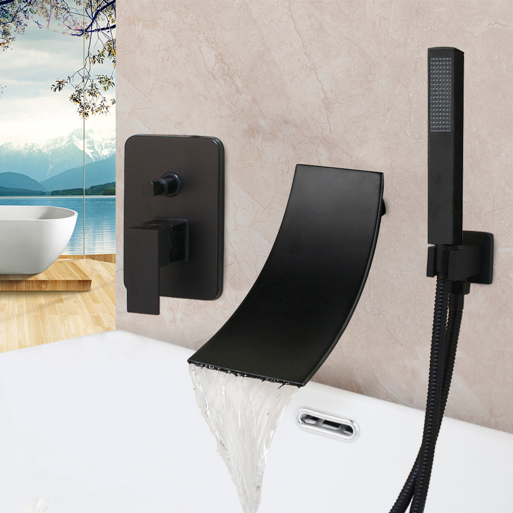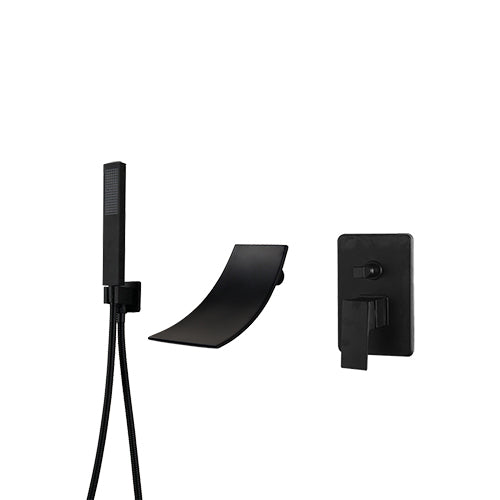 Schwarzer Wasserfall-Badewannenhahn mit passendem Bedienhebel und Handbrause.