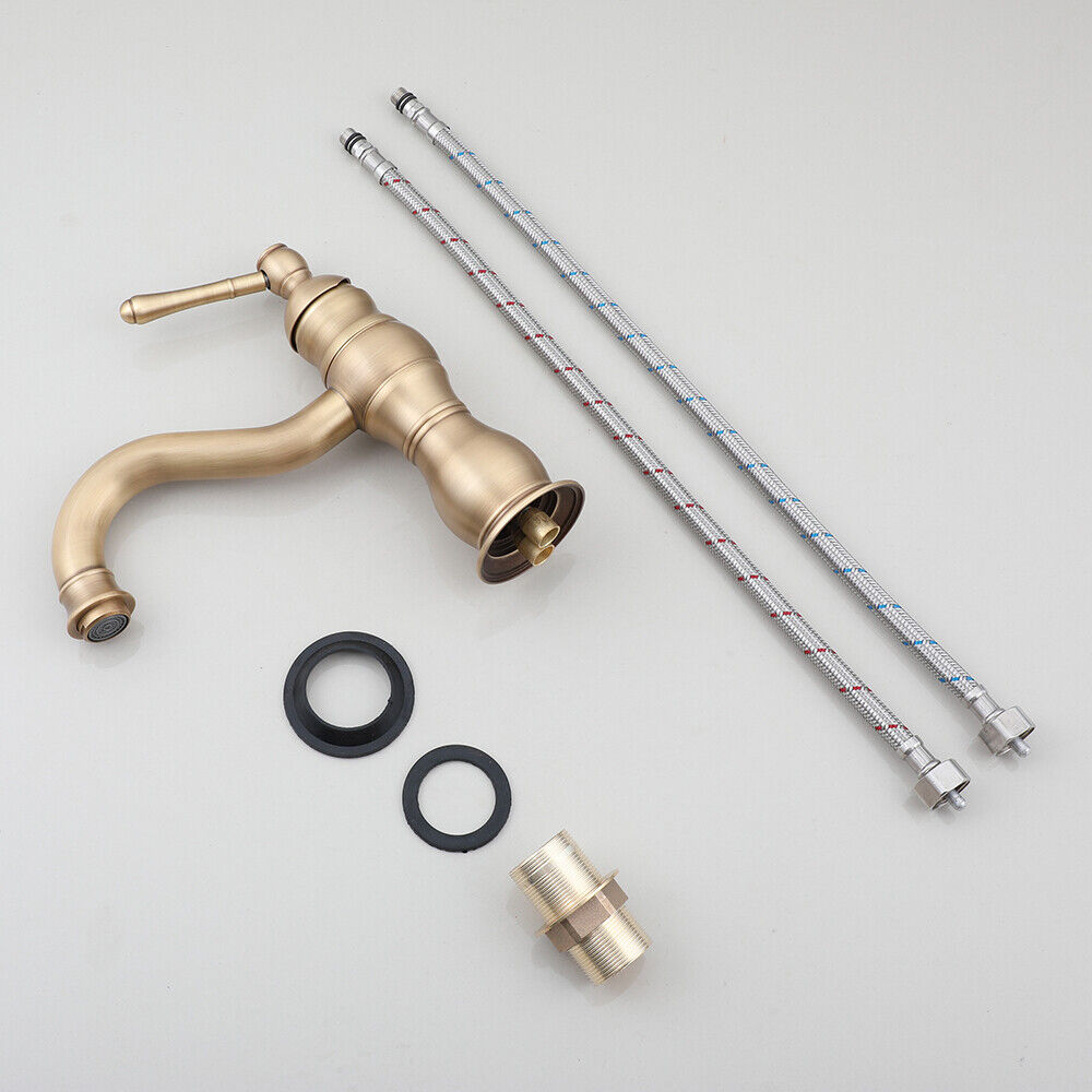 - The antique washbasin faucet has a brass body and a bronze finish.