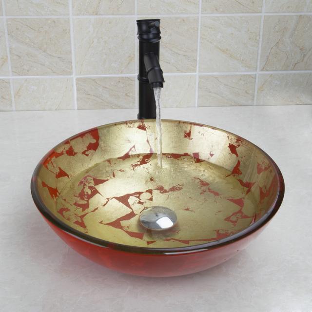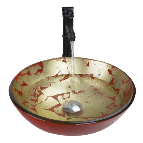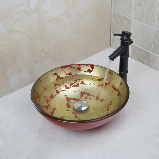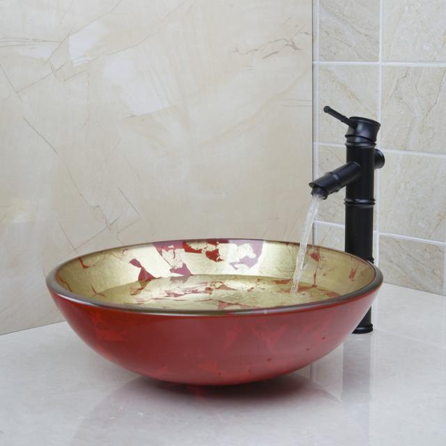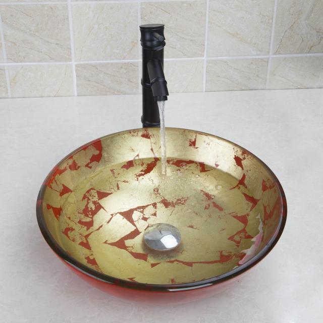 The tap has an oil bronze finish and matches beautifully with the gold/red glass hand-painted wash basin.