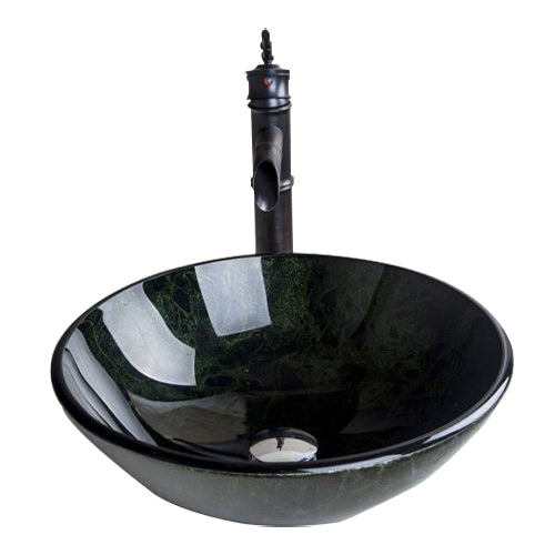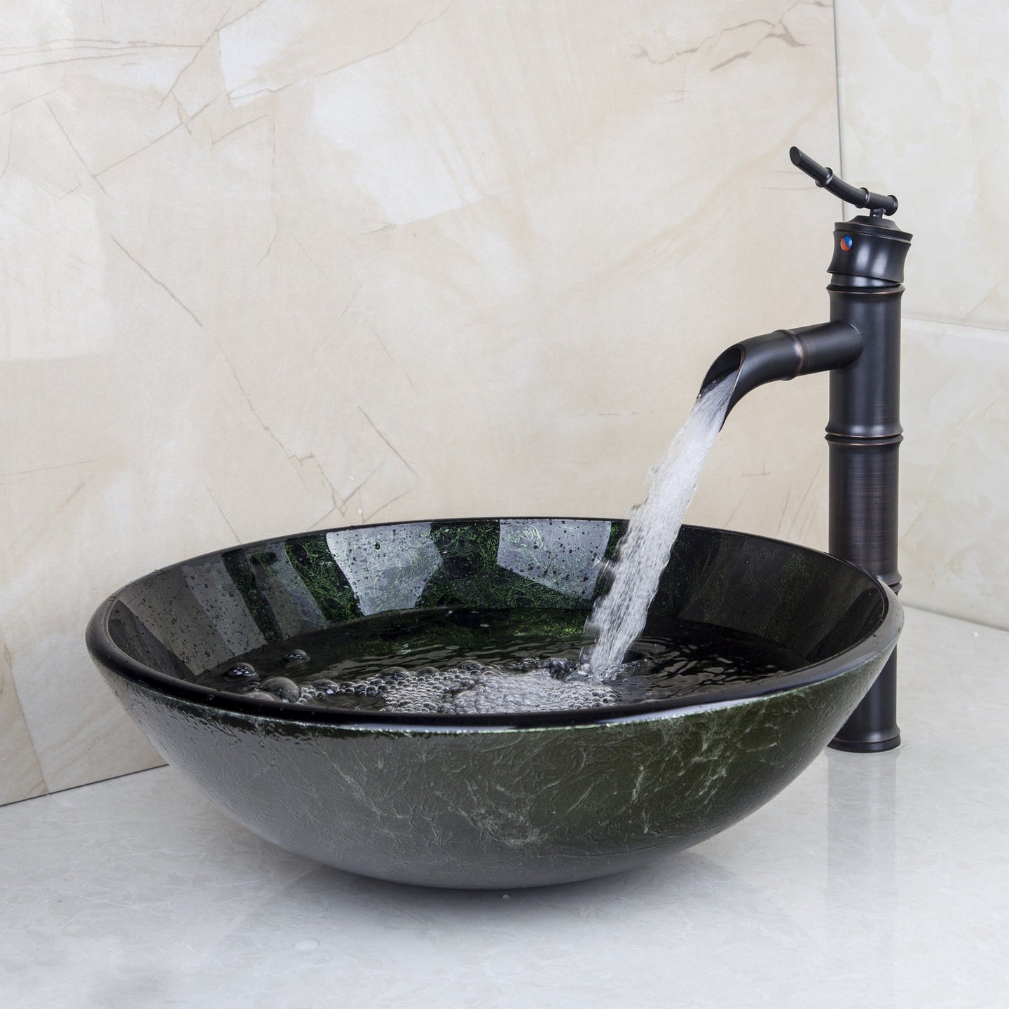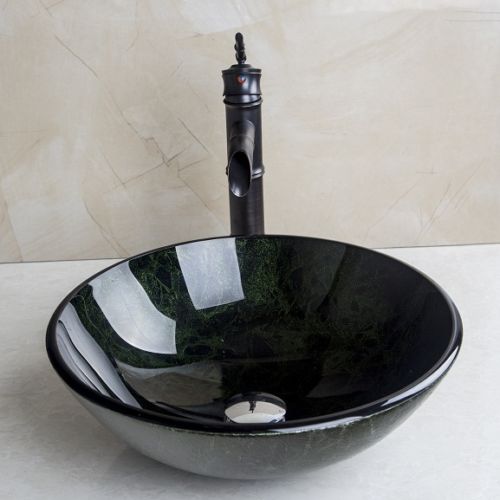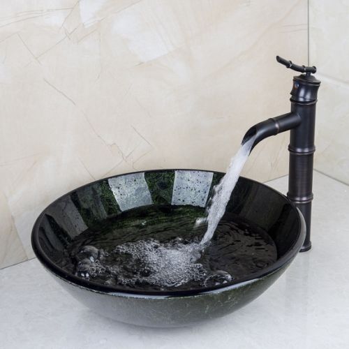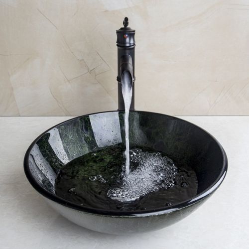 The nostalgic oil bronze washbasin tap matches beautifully with the hand-painted glass wash basin.