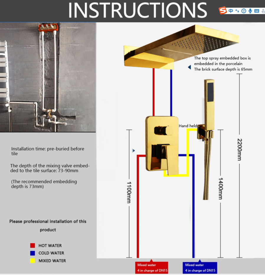 Specifications of the golden built-in shower: