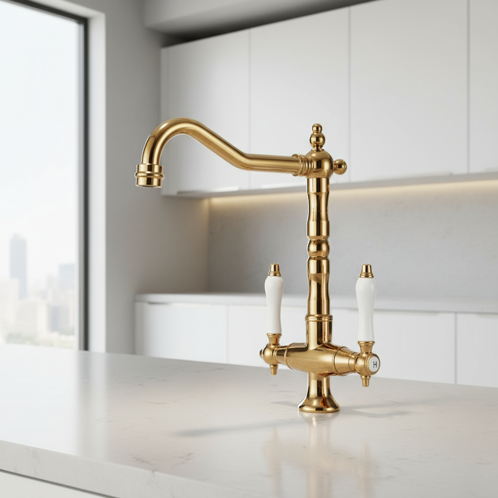 Breng warme, tijdloze klasse in je keuken met deze goudkleurige keukenkraan in klassieke stijl. De kraan is uitgevoerd met twee porseleinen hendels voor warm en koud water en een sierlijke hoge uitloop, ideaal voor dagelijks gebruik in landelijke en retro keukens.