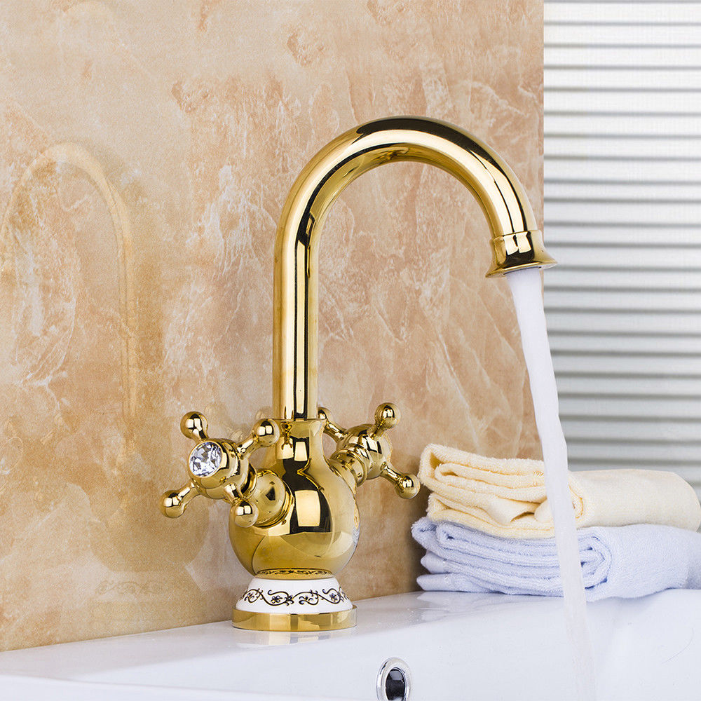 - The base of this gold tap has a ceramic finish (white with a motif).