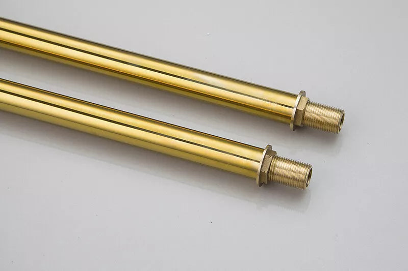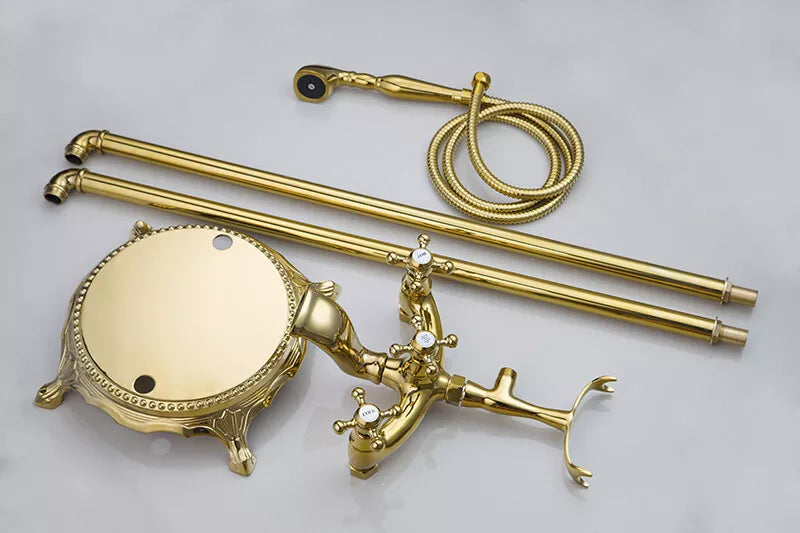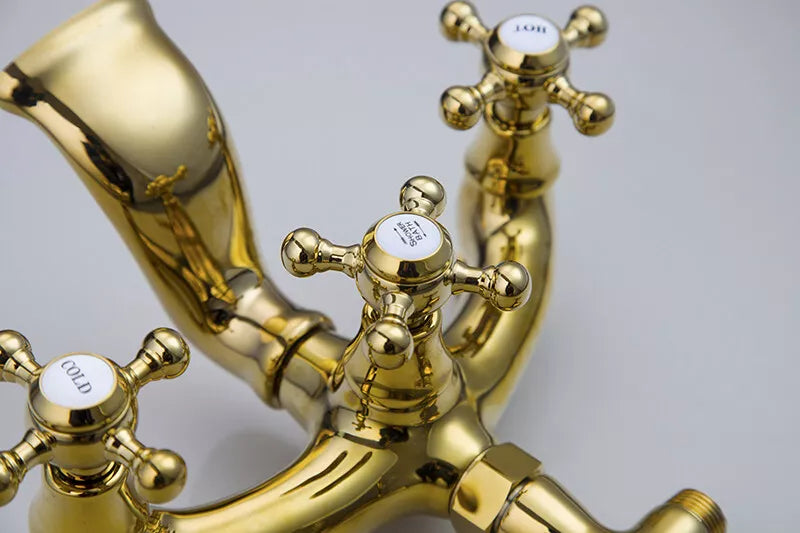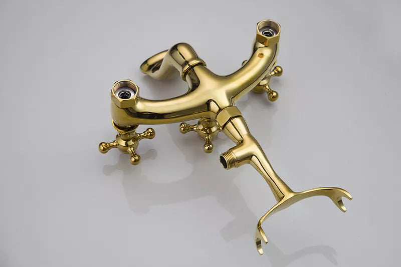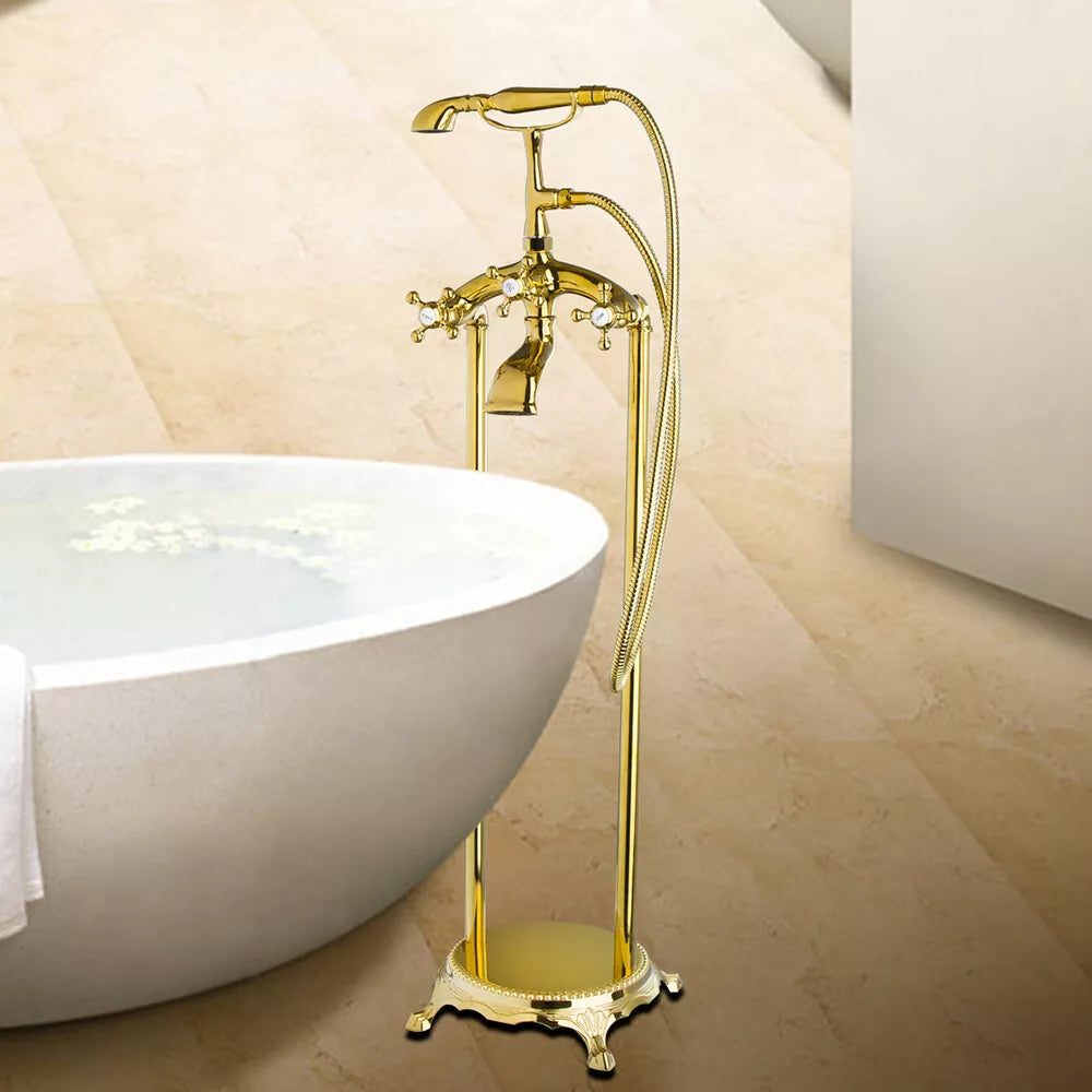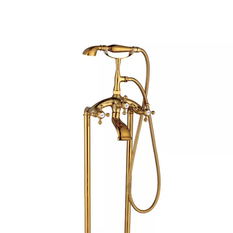This elegant freestanding bath faucet combines a nostalgic look with modern functionality. The faucet features a beautiful gold finish that adds a touch of luxury to any bathroom. It's a perfect fit for both rustic and classic bathroom styles.