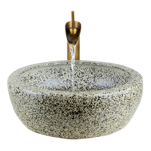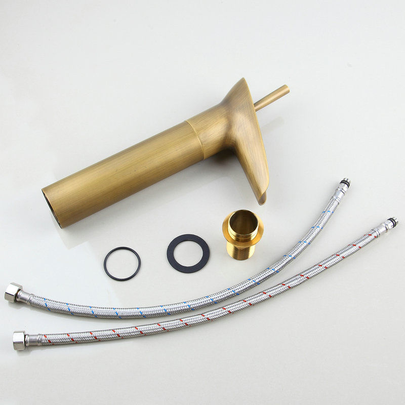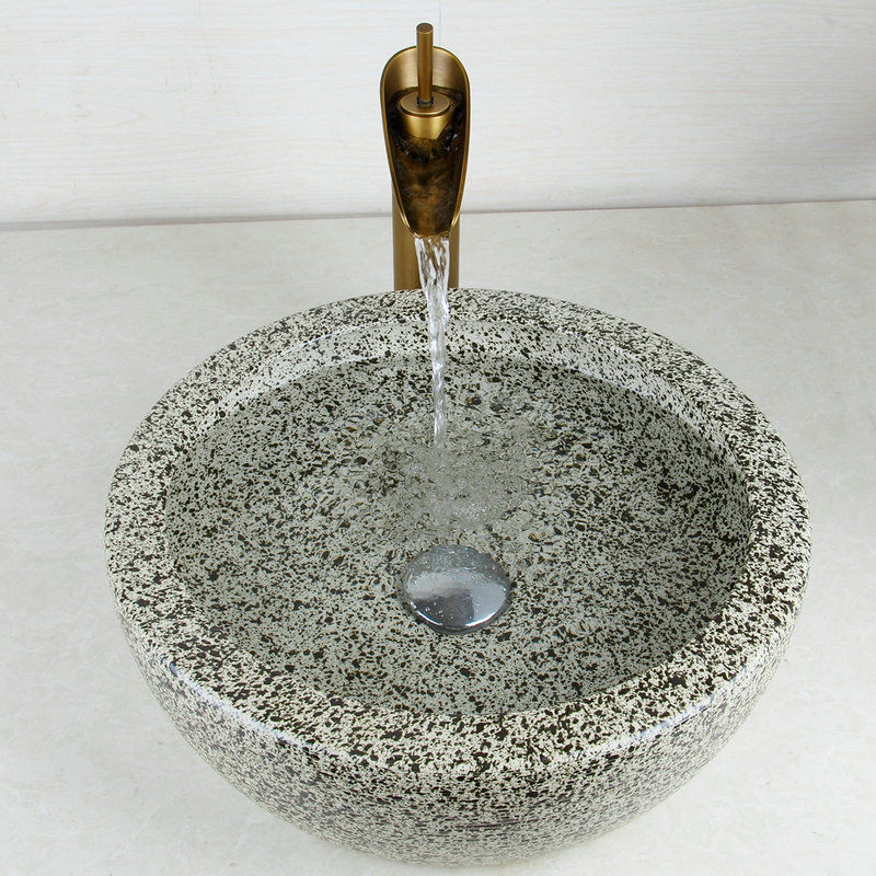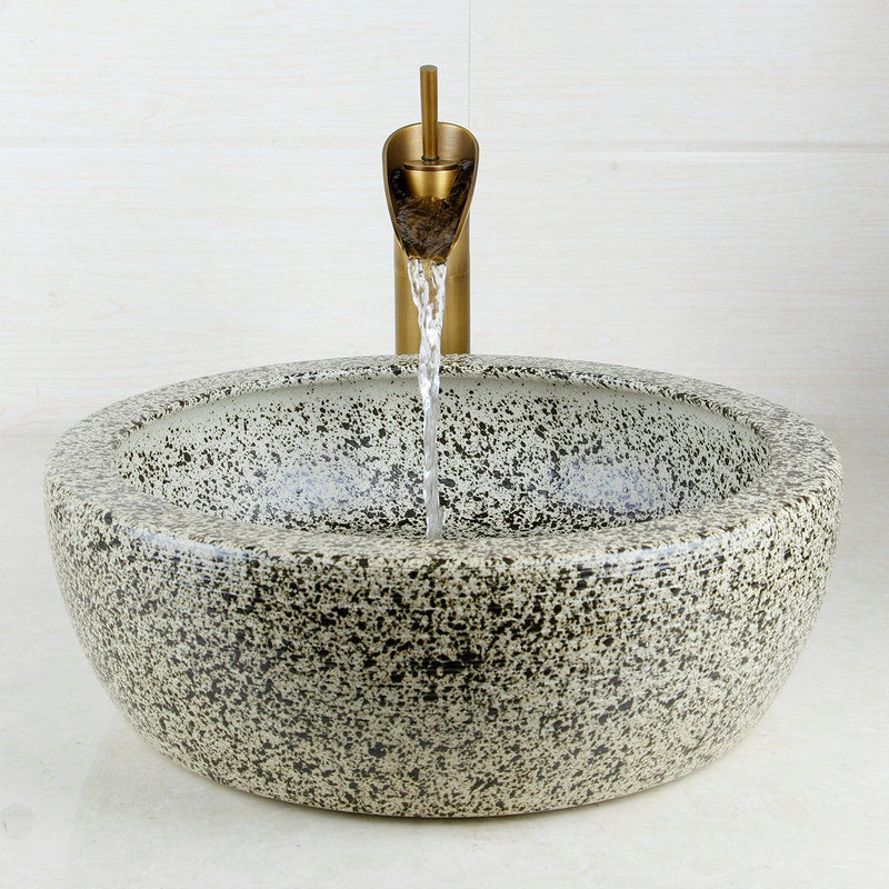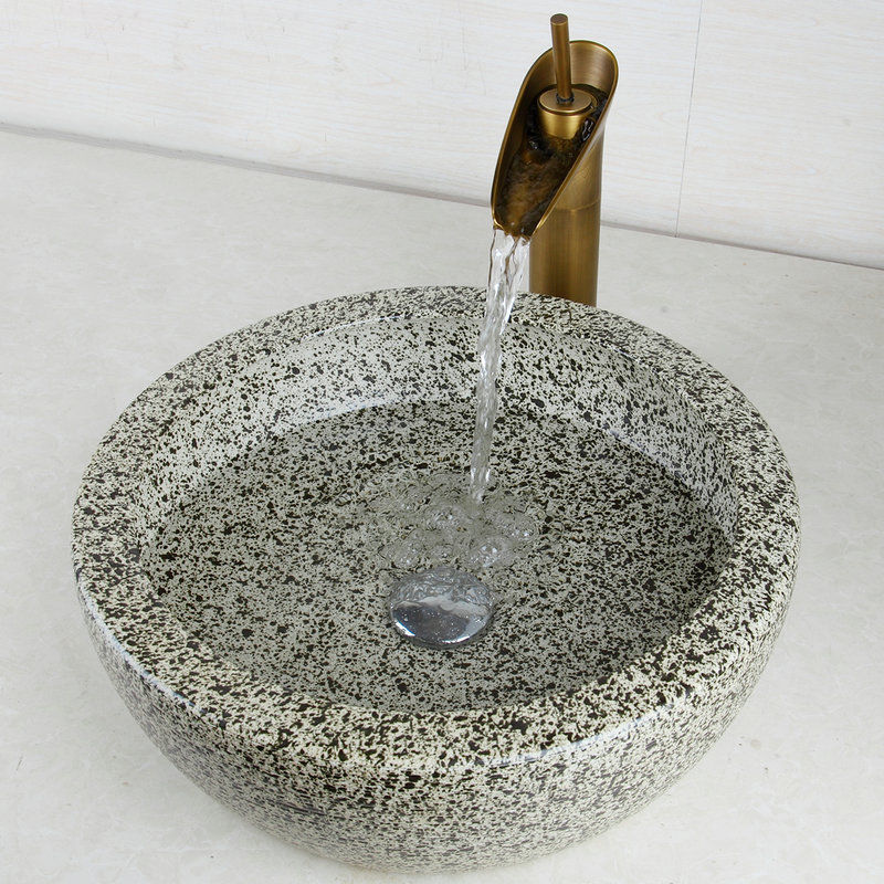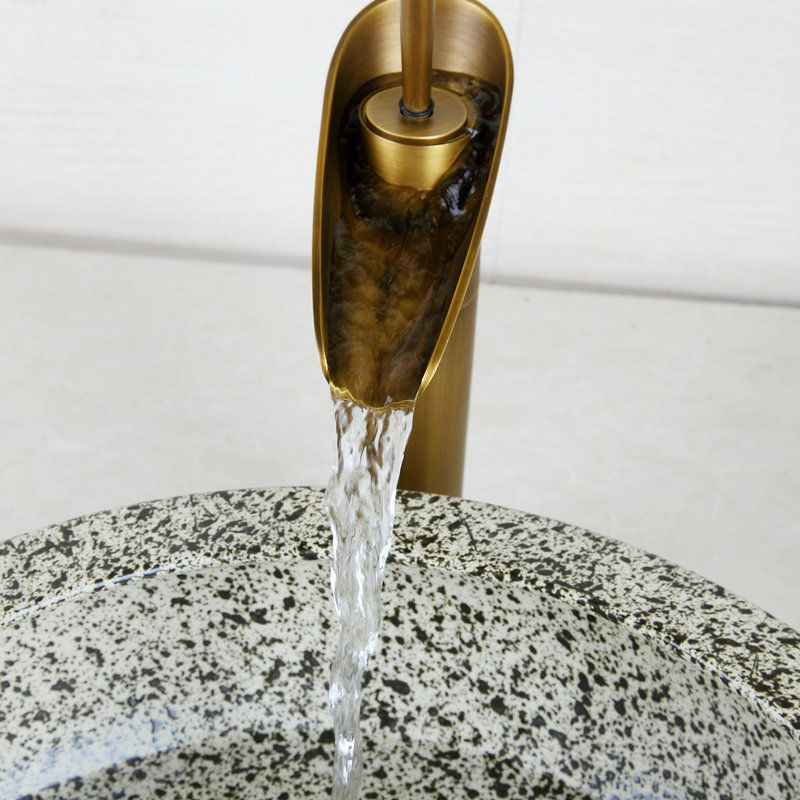 The nostalgic bronze waterfall washbasin tap matches beautifully with the ceramic washbasin.