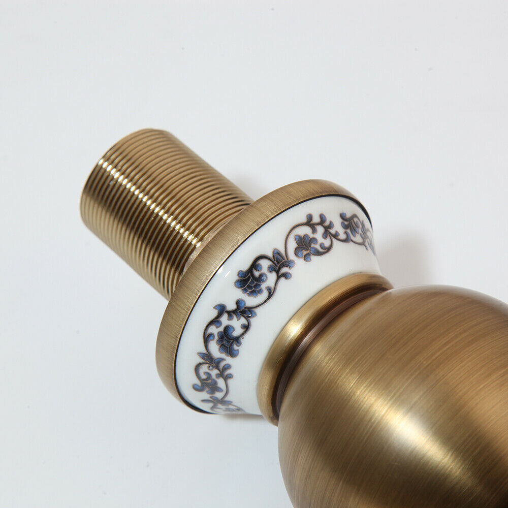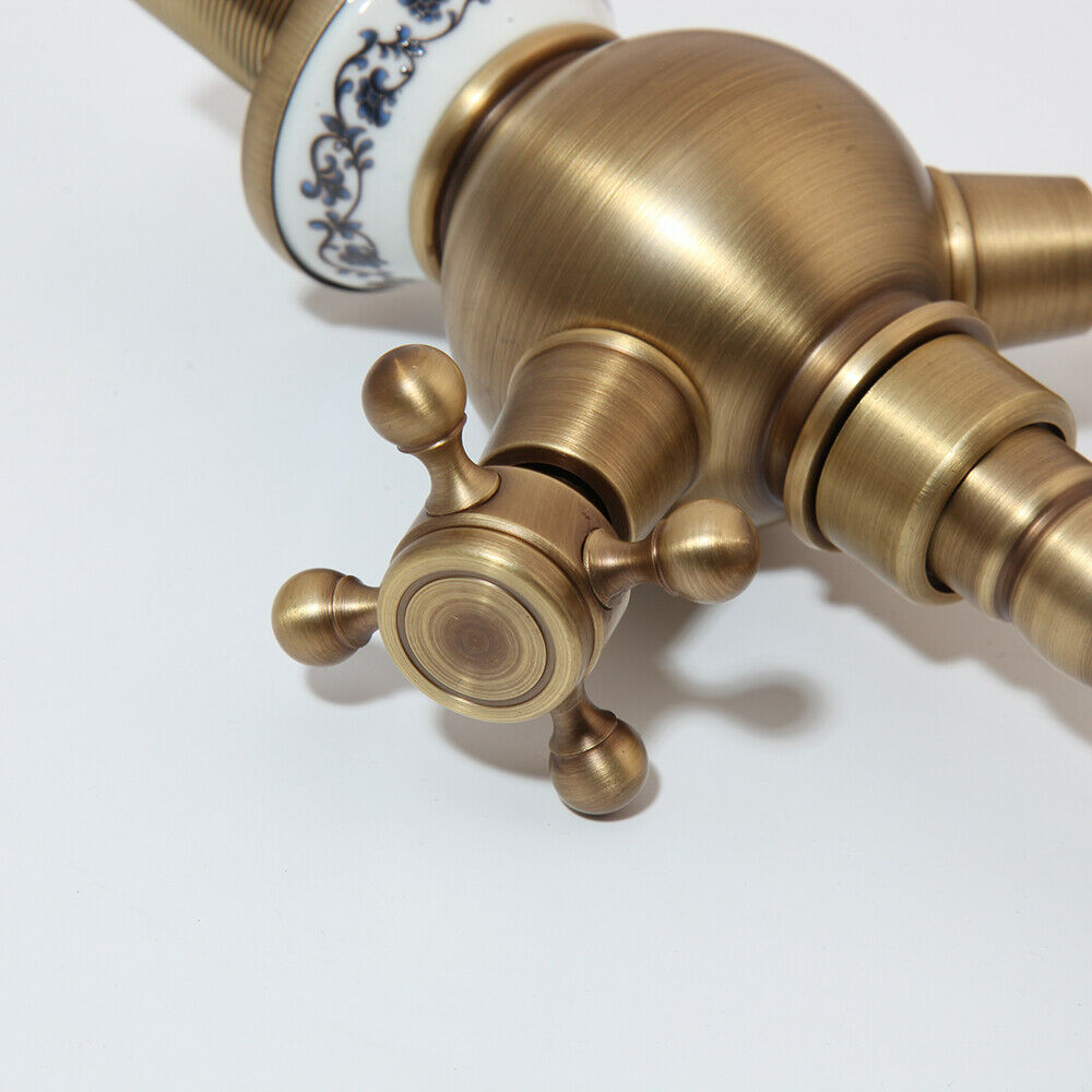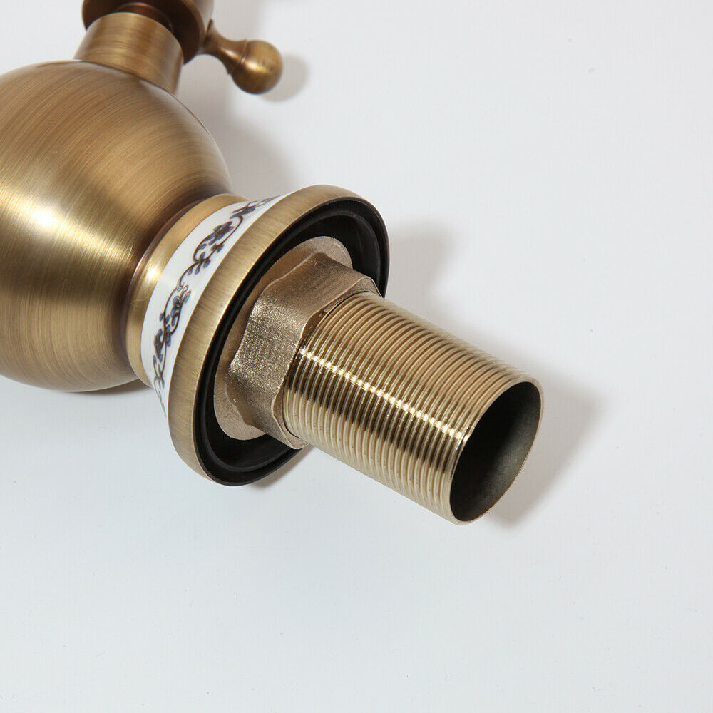 The country kitchen faucet has a brass body finished with bronze and a white ceramic decoration on the base.