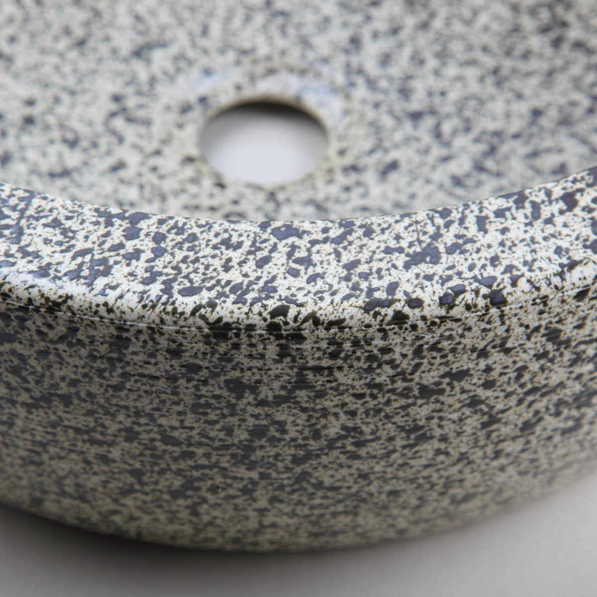A sturdy ceramic washbasin with a rustic look. This washbasin complements any color faucet.