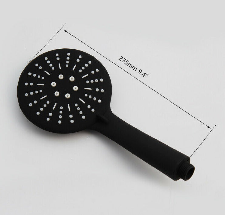 - The black round hand shower has multiple spray modes.