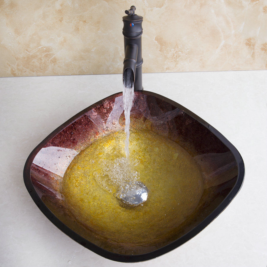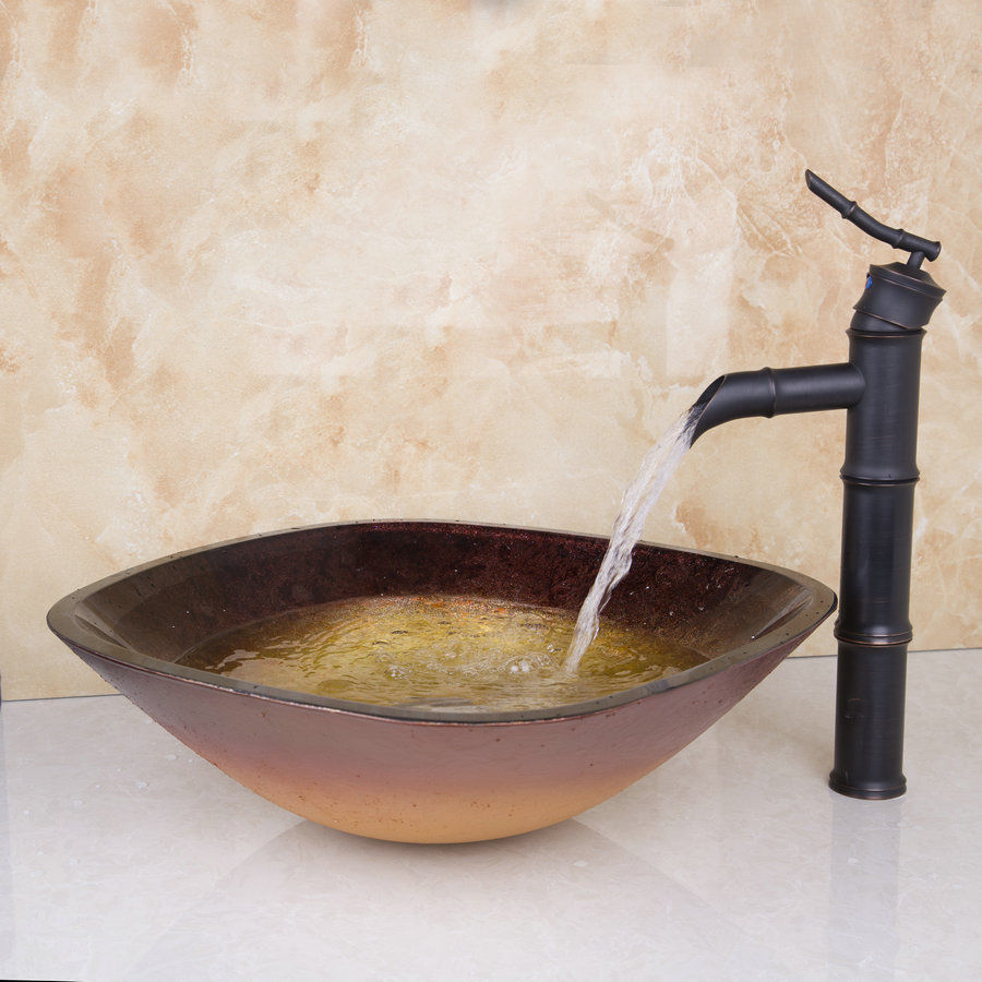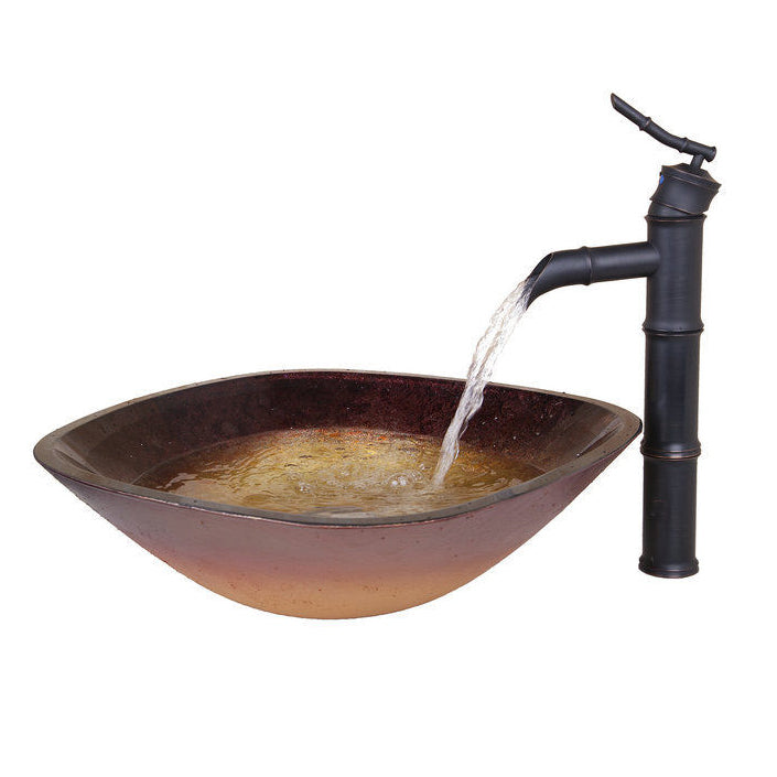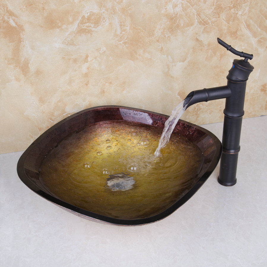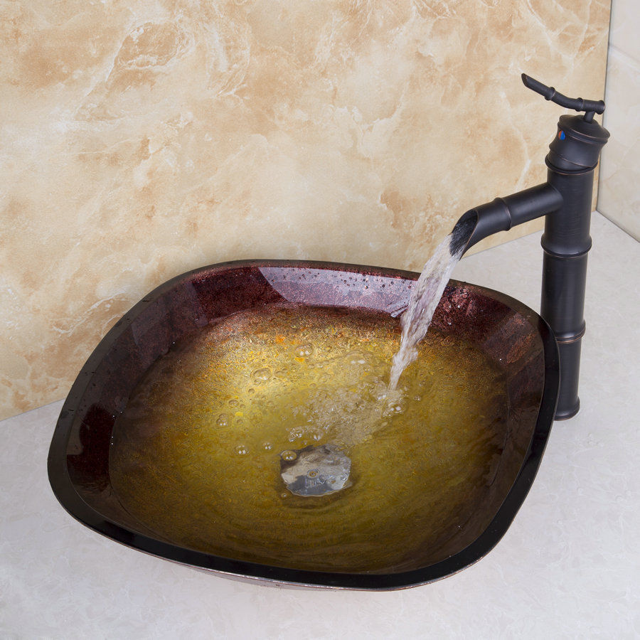 - Square red/gold-yellow washbasin with bamboo tap in oil bronze.