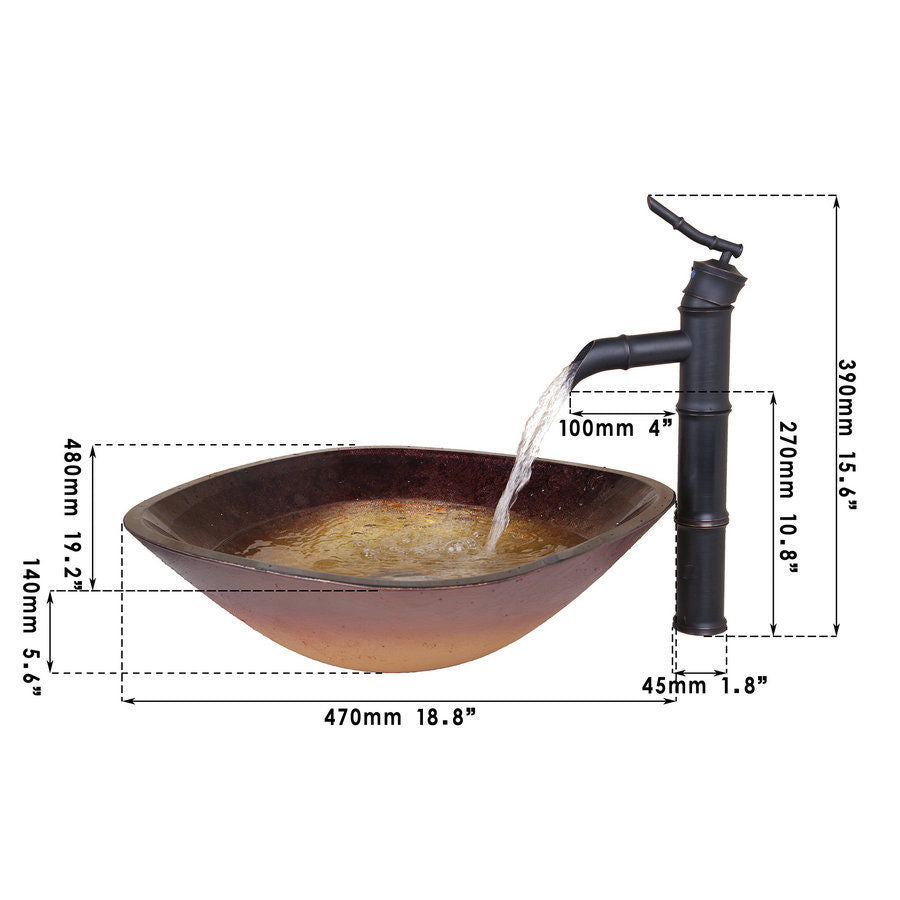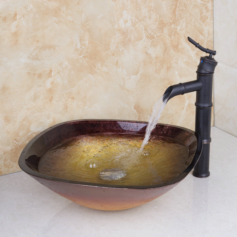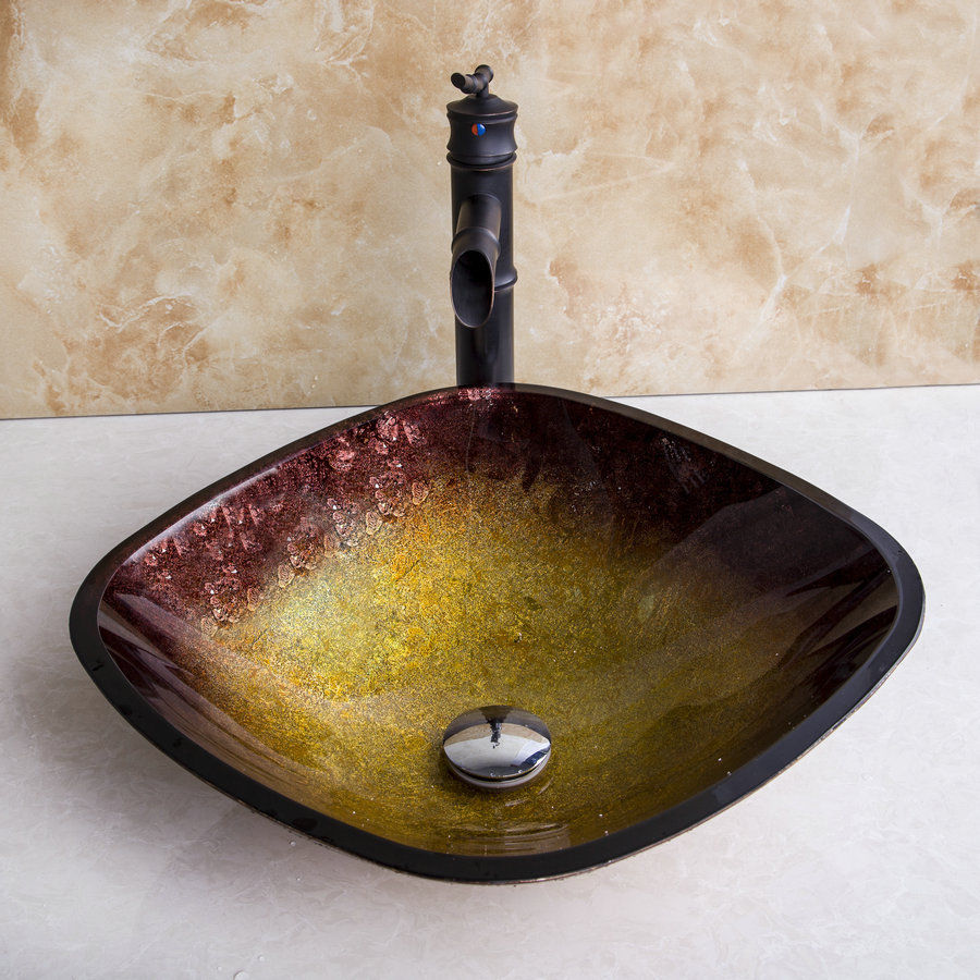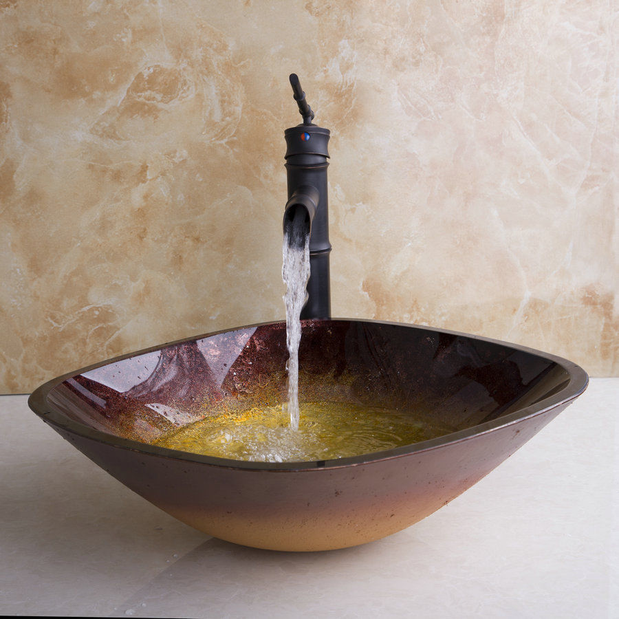- Square red/gold-yellow washbasin with bamboo tap in oil bronze.