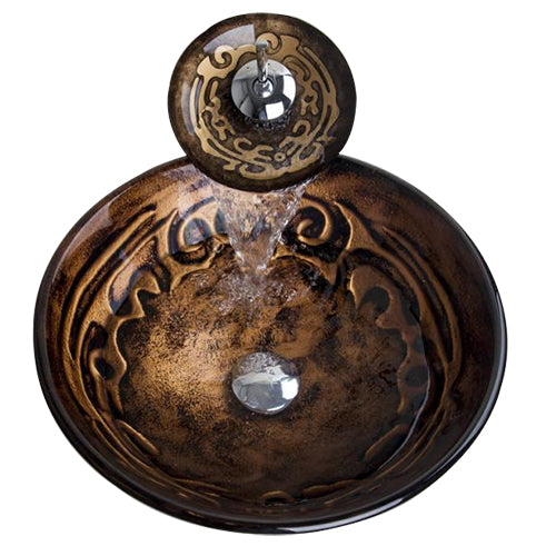 The chrome waterfall faucet complements the hand-painted glass basin beautifully. The basin is brown and features a patterned interior (please see the product photos). The waterfall faucet has the same pattern on the glass spout. This makes for a very stylish combination!