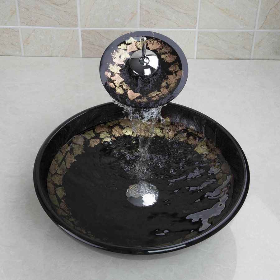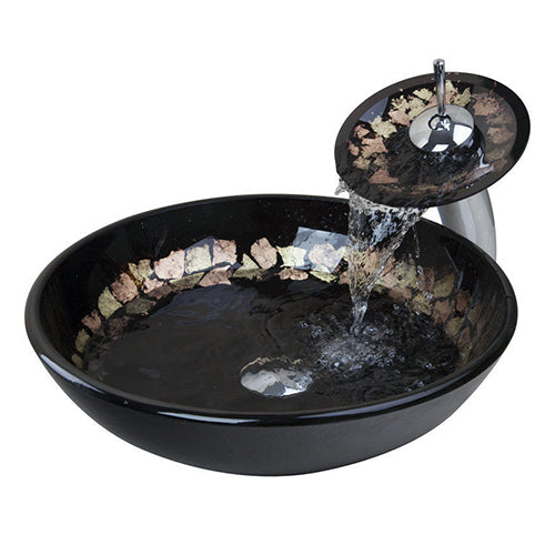 The chrome waterfall faucet complements the hand-painted glass basin beautifully. The basin is dark in color and features a patterned interior (please see the product photos). The waterfall faucet has the same pattern on the glass spout. This makes for a very stylish combination!