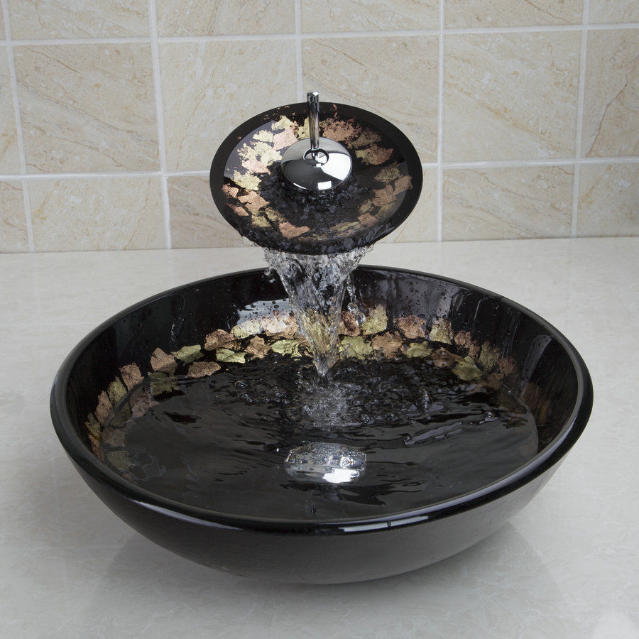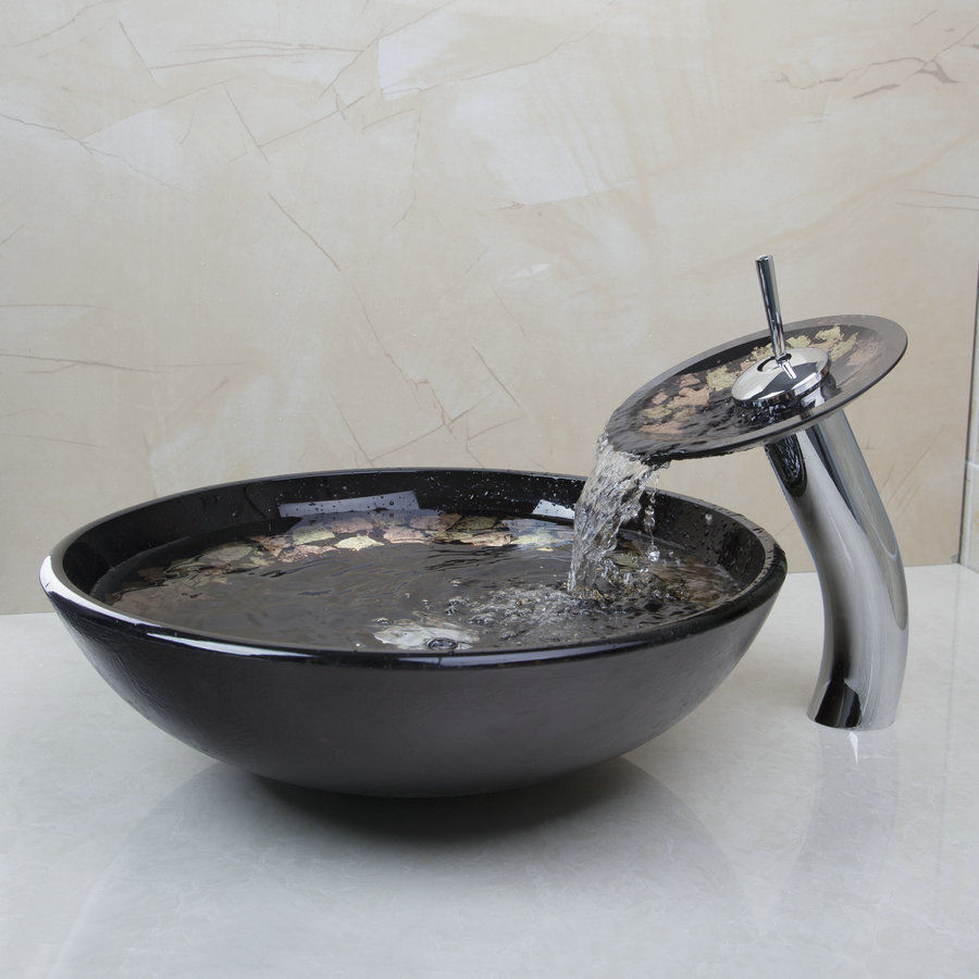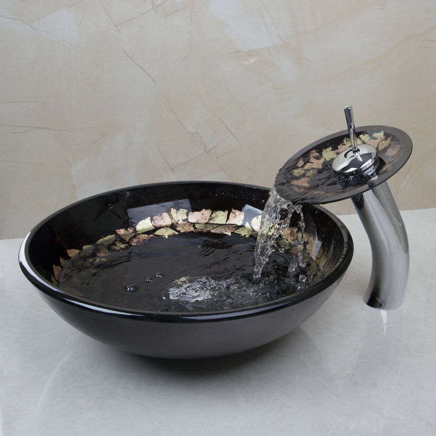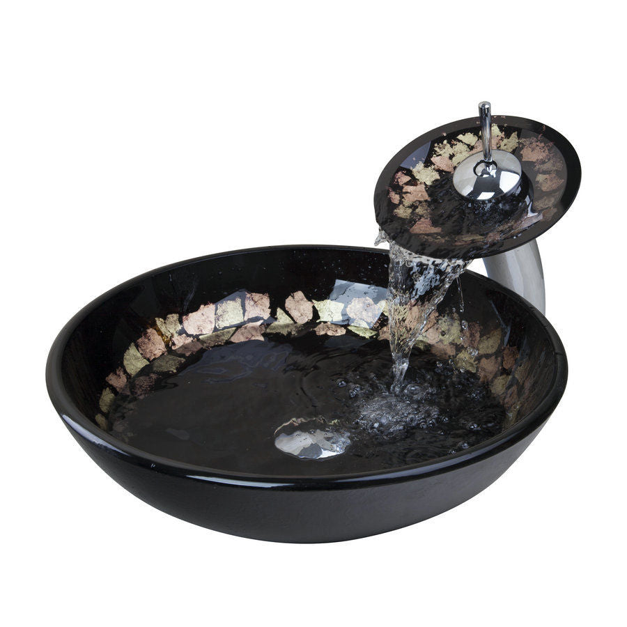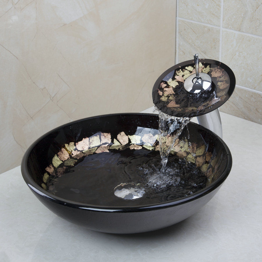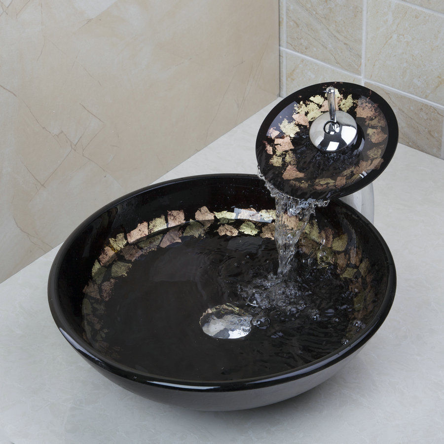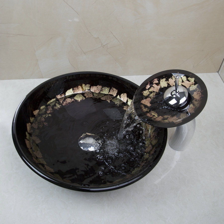Waterfall tap with round glass mouth and tempered glass washbasin, dark design