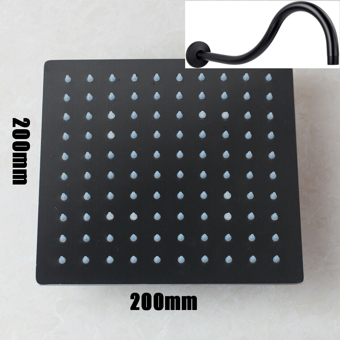 Beautiful, elegantly curved shower arm with a square black shower head.