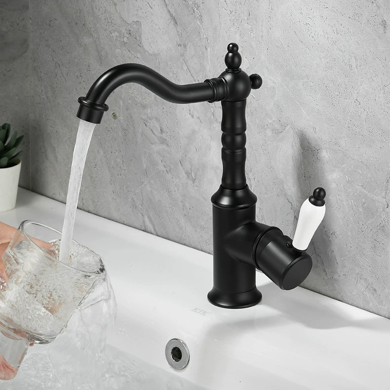 Deze klassieke wastafelkraan in zwart geeft de badkamer of keuken een elegante, tijdloze uitstraling. De sierlijke uitloop, verfijnde details en de porseleinen hendel zorgen voor een authentieke landelijke stijl met een luxe afwerking.