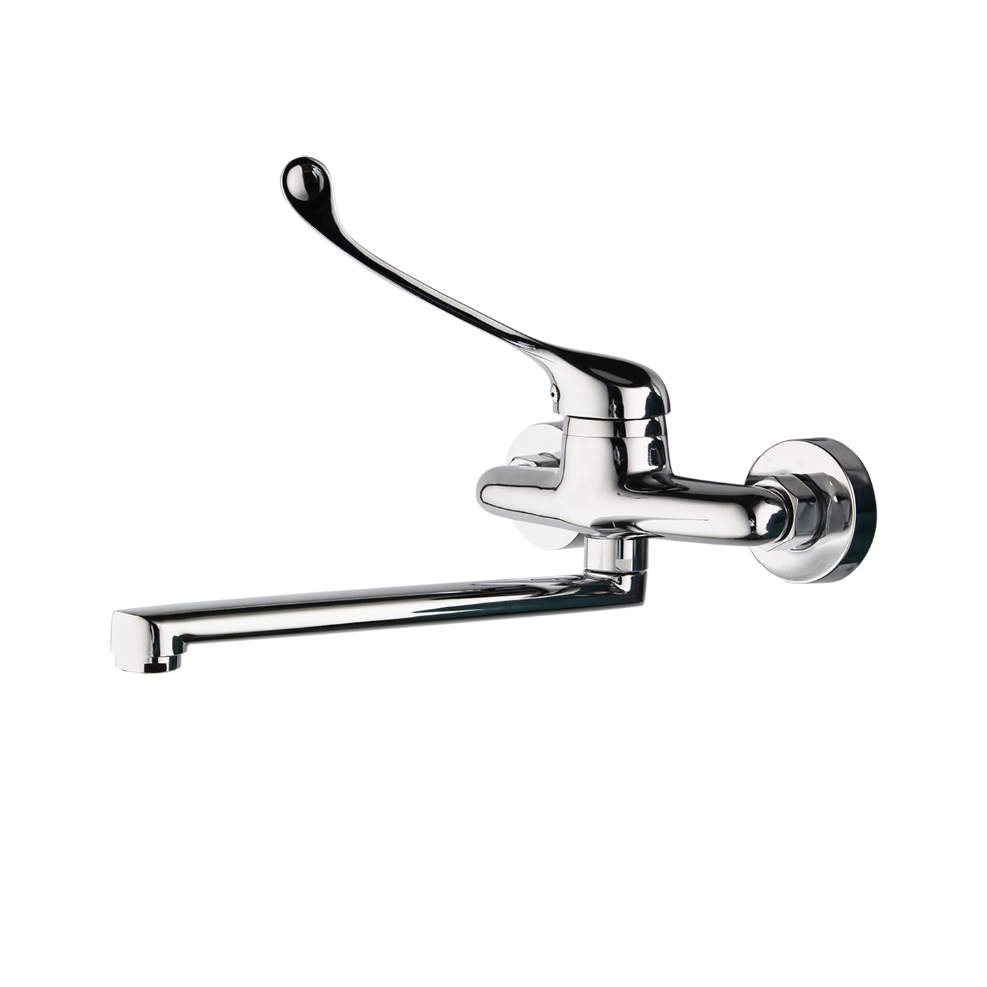 Chroom kraan met een lange uitloop en een extra lange bedieningshendel voor een hygiënisch gebruik van de kraan.