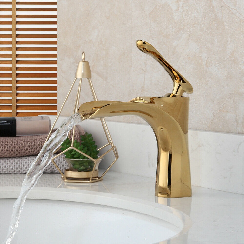 Elegante gouden watervalkraan voor op de wastafel.