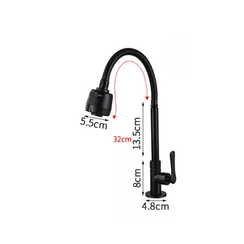 Geef uw badkamer of keuken een moderne uitstraling met deze stijlvolle mat zwarte koudwaterkraan. De kraan combineert een nostalgisch design met praktische functies zoals een flexibele hals en een sproeikop met twee standen, wat zorgt voor extra gebruiksgemak.