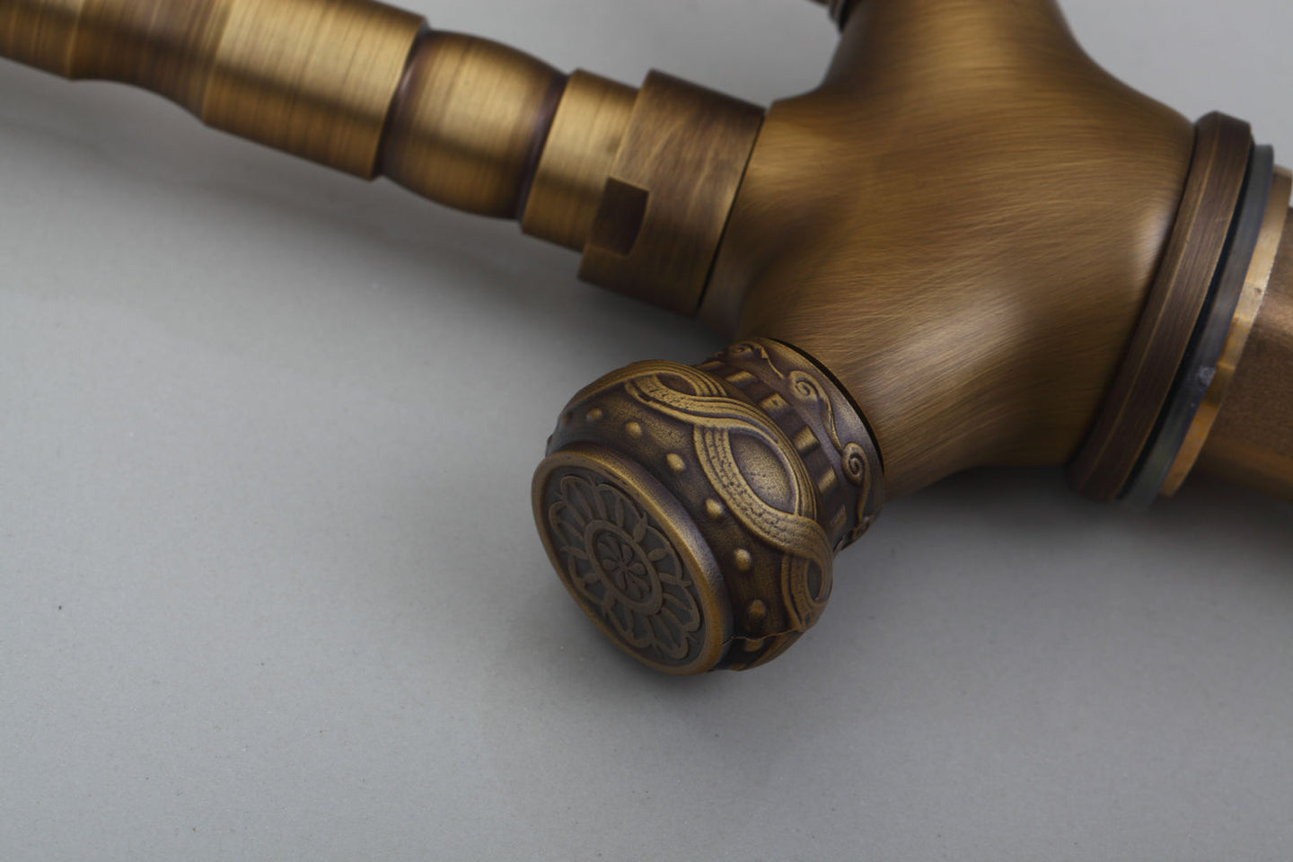 - De antieke kraan heeft een messing body welke met brons is afgewerkt en ronde bedeiningsknoppen met een elegant motief.