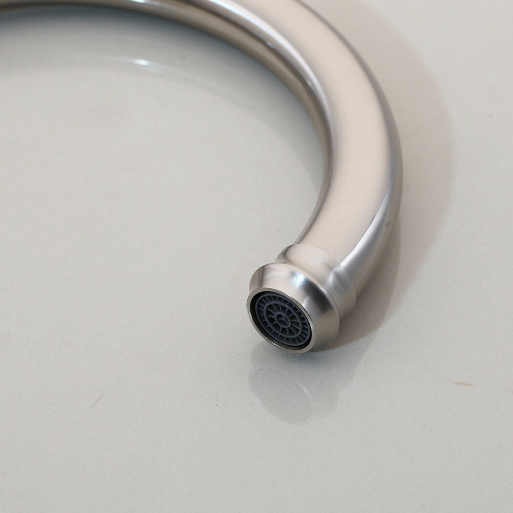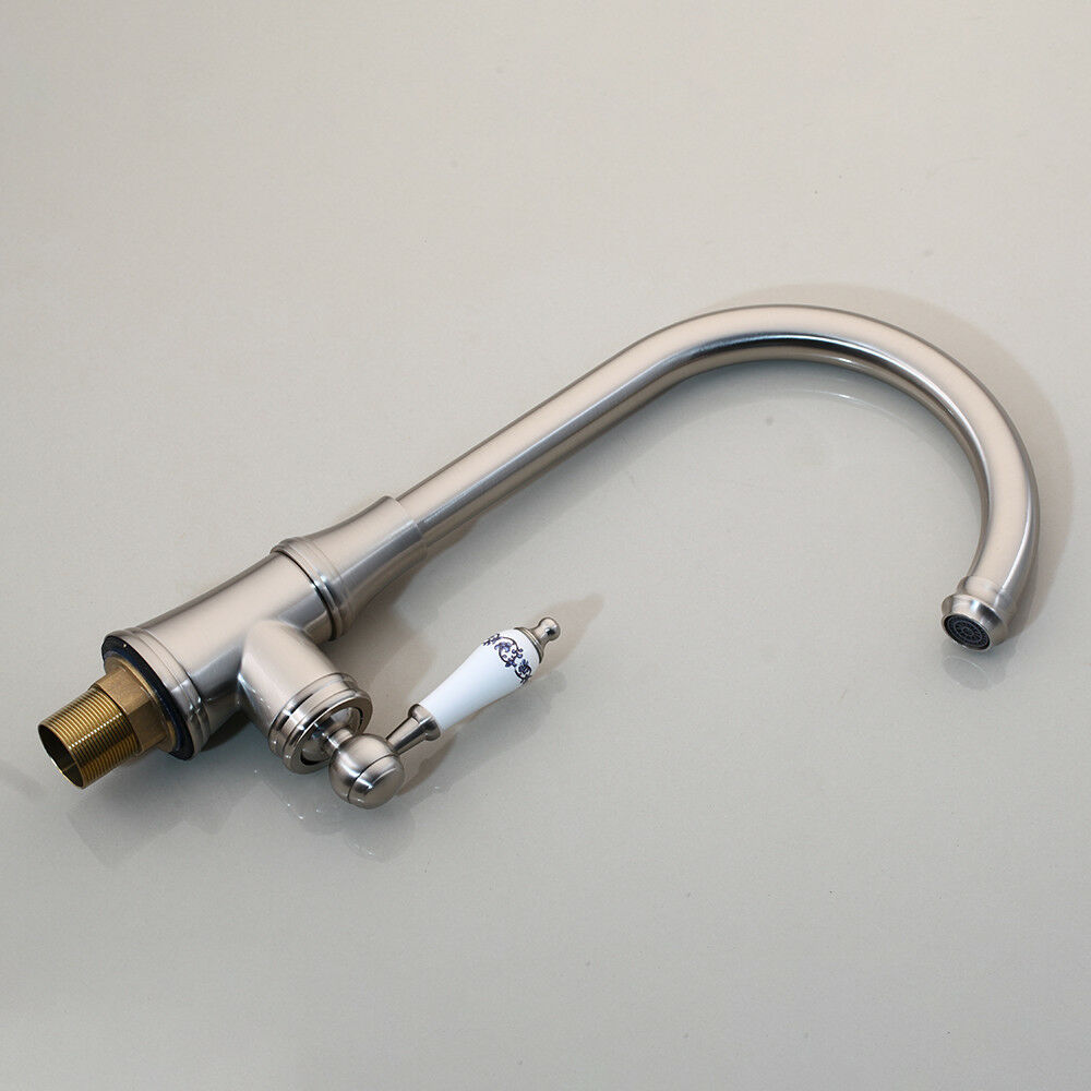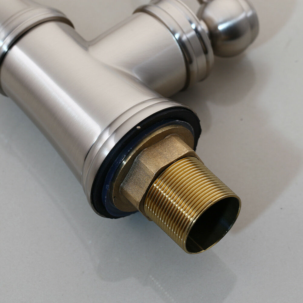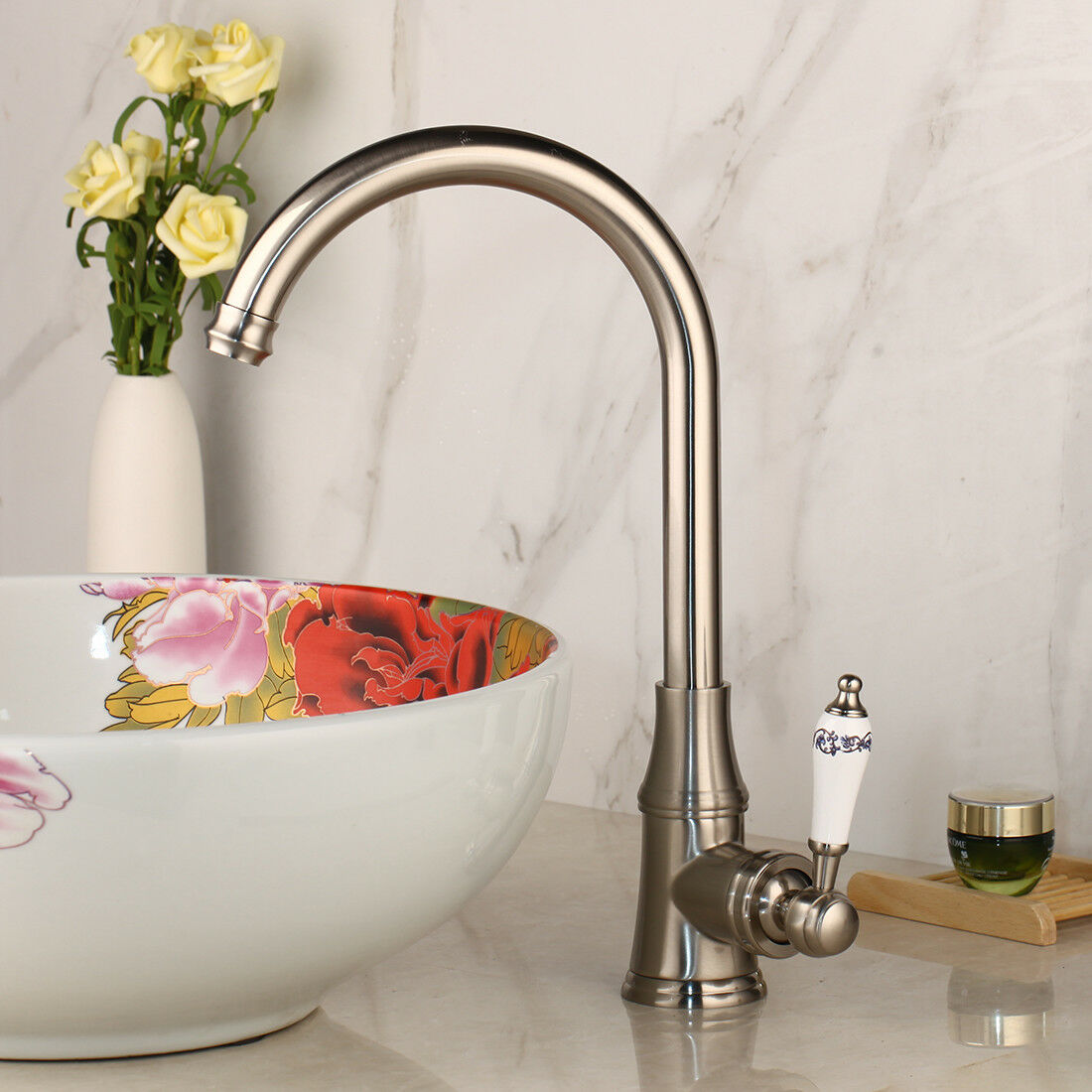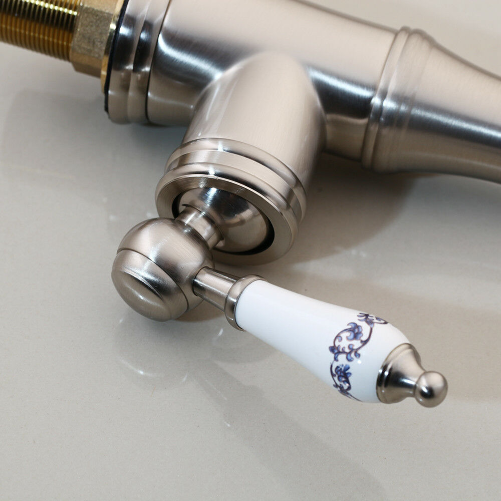 Geborsteld nikkel wastafelkraan in een nostalgische afwerking.