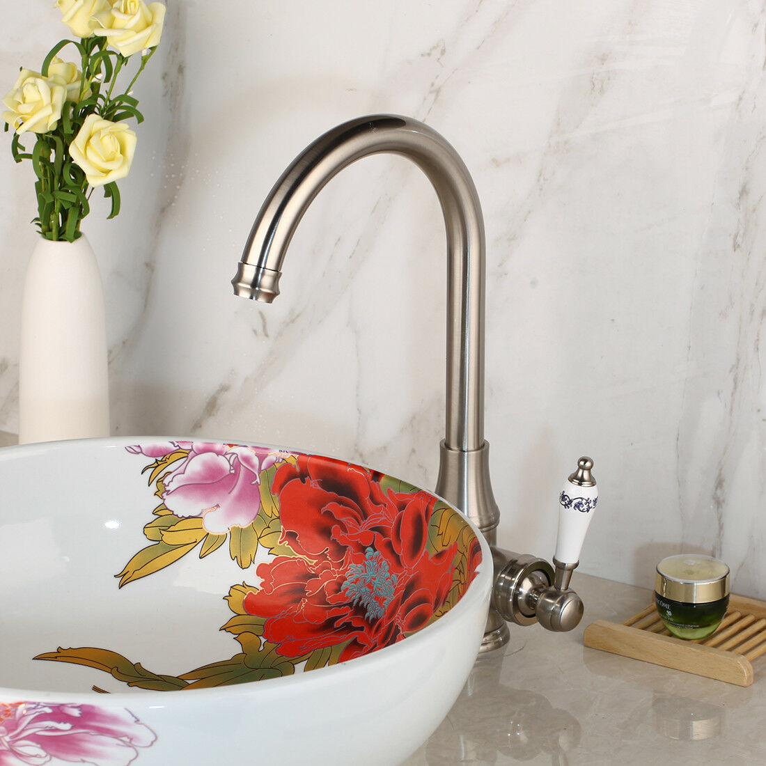 De eengreeps hendel is voorzien van een aardewerk handvat met elegante versieringen er op.