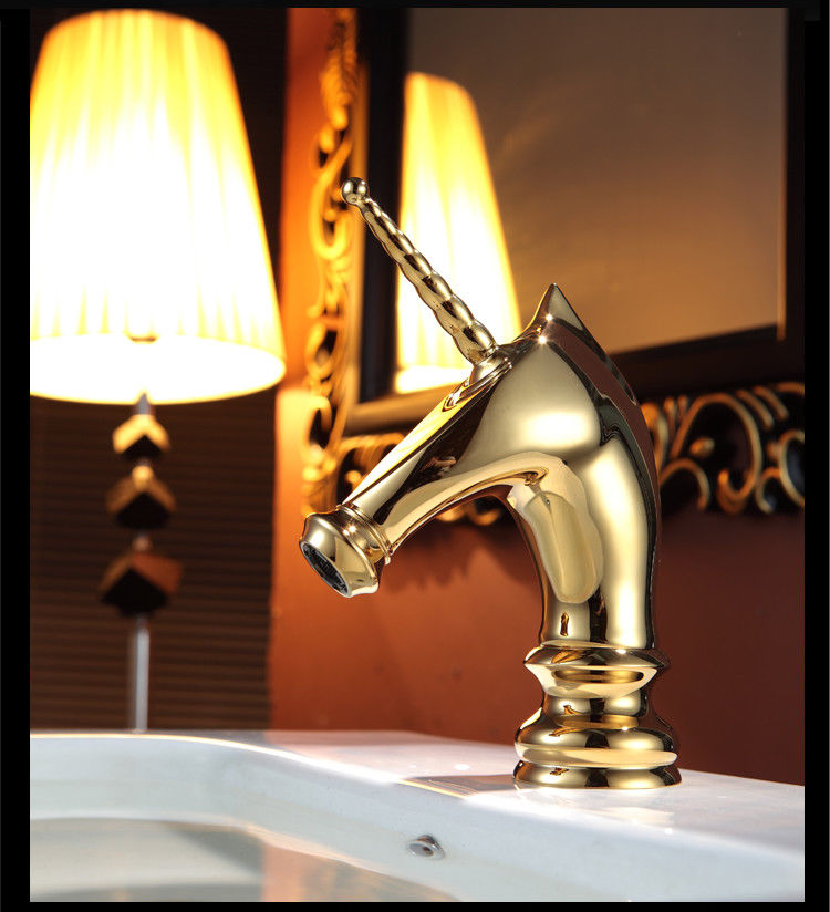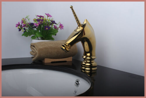 Gouden eenhoorn wastafelkraan met een fraaie eengreeps bediening middels de hoorn van de eenhoorn/unicorn.