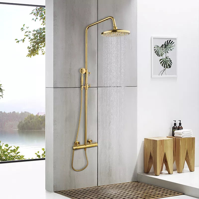 De goudkleurige thermostatische opbouw regendouche biedt een combinatie van luxe, functionaliteit en comfort. Perfect voor iedereen die zijn badkamer een verfijnde uitstraling wil geven met hoogwaardige materialen en een gebruiksvriendelijke bediening.