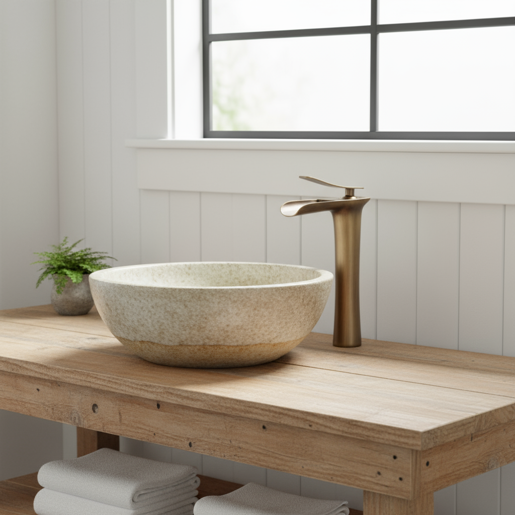 Dankzij de royale hoogte is deze kraan perfect geschikt voor een opbouw waskom. De brede uitloop zorgt voor een sierlijke watervalstroom, wat een elegante en rustieke sfeer toevoegt aan uw badkamerinterieur.