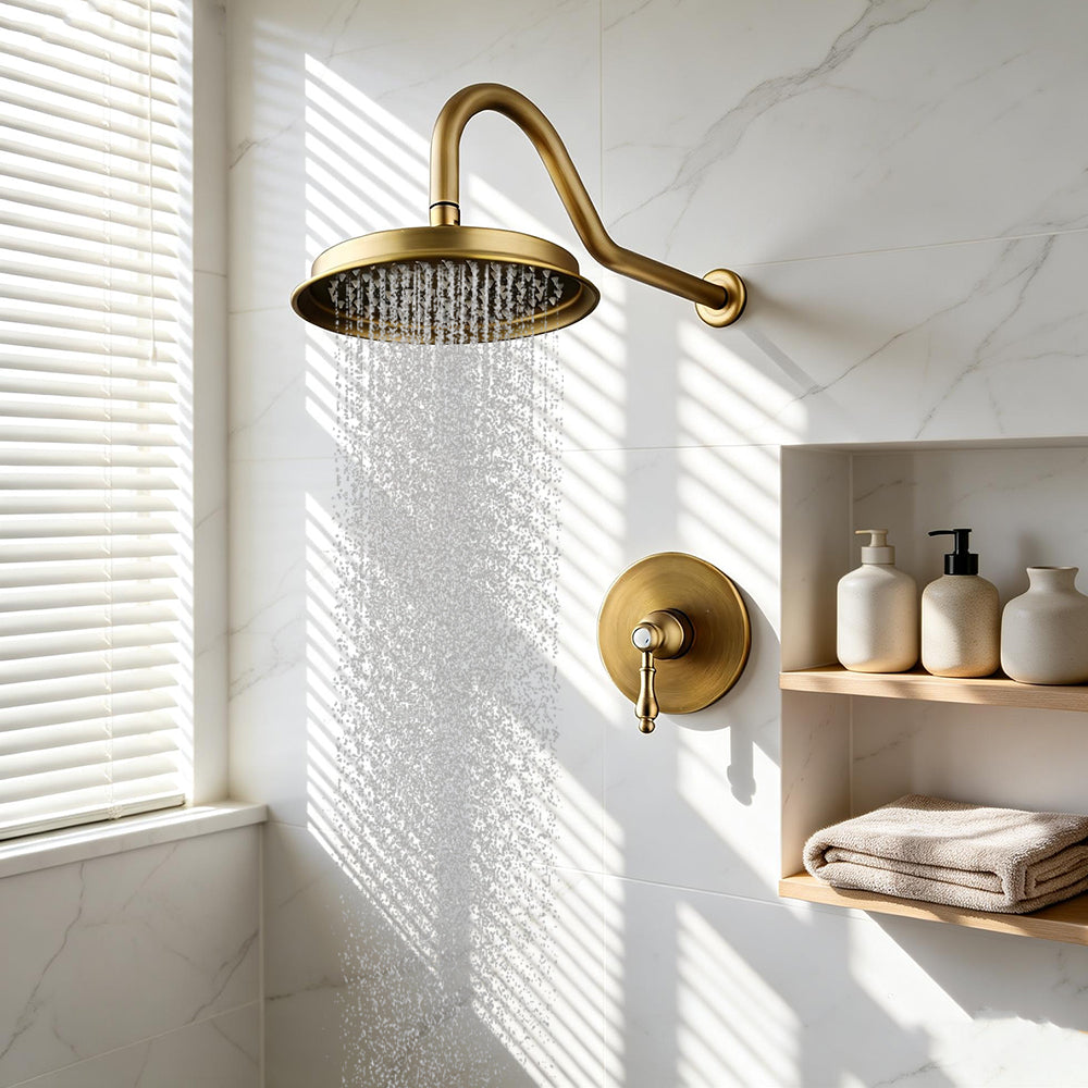 Bestel vandaag nog en geef je badkamer een warme, landelijke uitstraling met deze stijlvolle bronskleurige regendouche set.