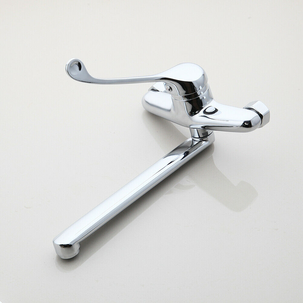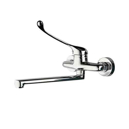 Chroom kraan met een lange uitloop en een extra lange bedieningshendel voor een hygiënisch gebruik van de kraan.