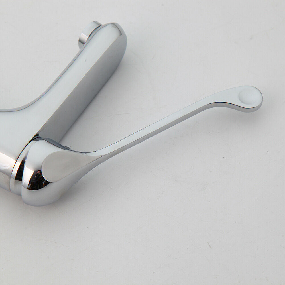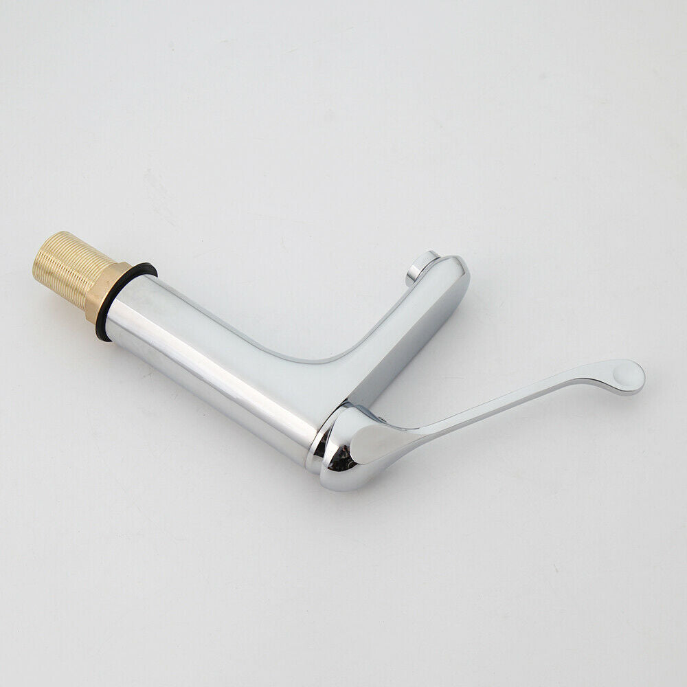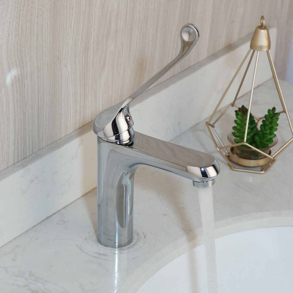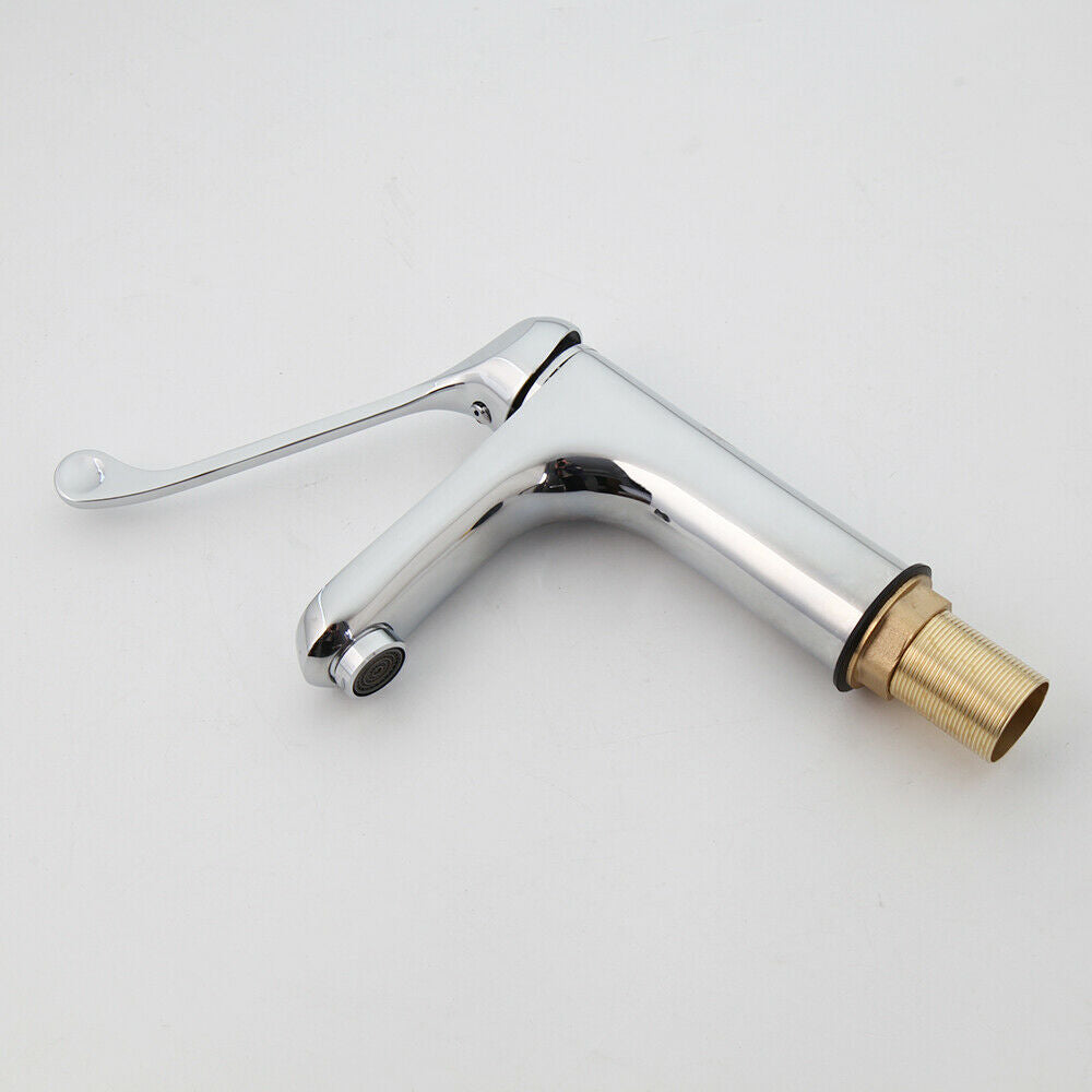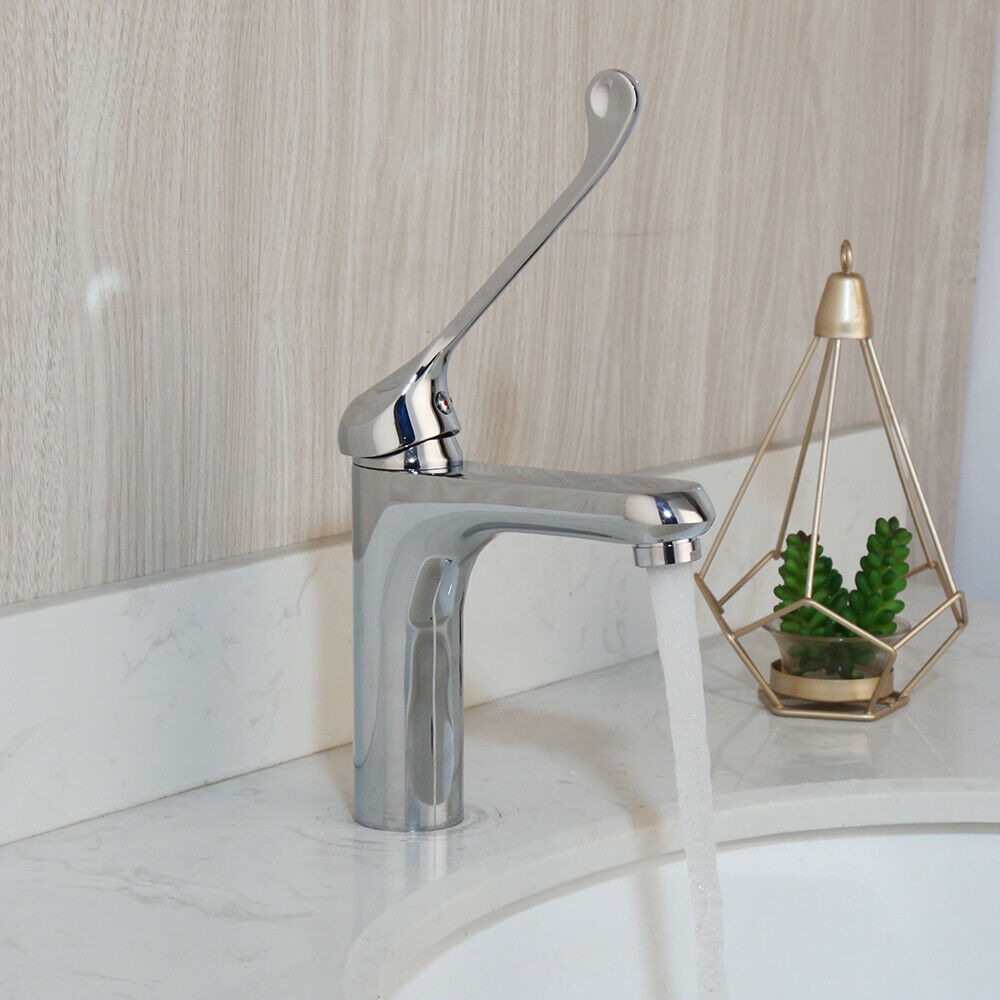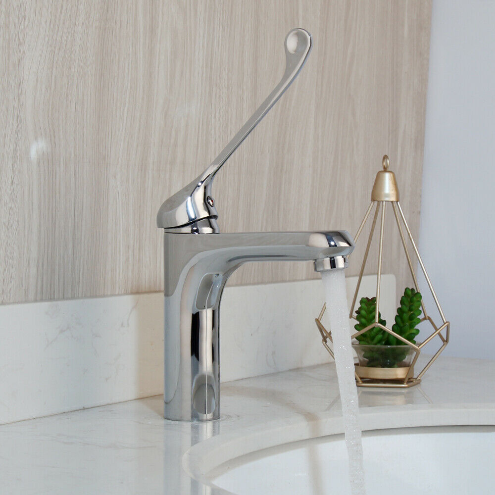 Chroom kraan met een extra lange bedieningshendel voor een hygiënisch gebruik van de kraan.