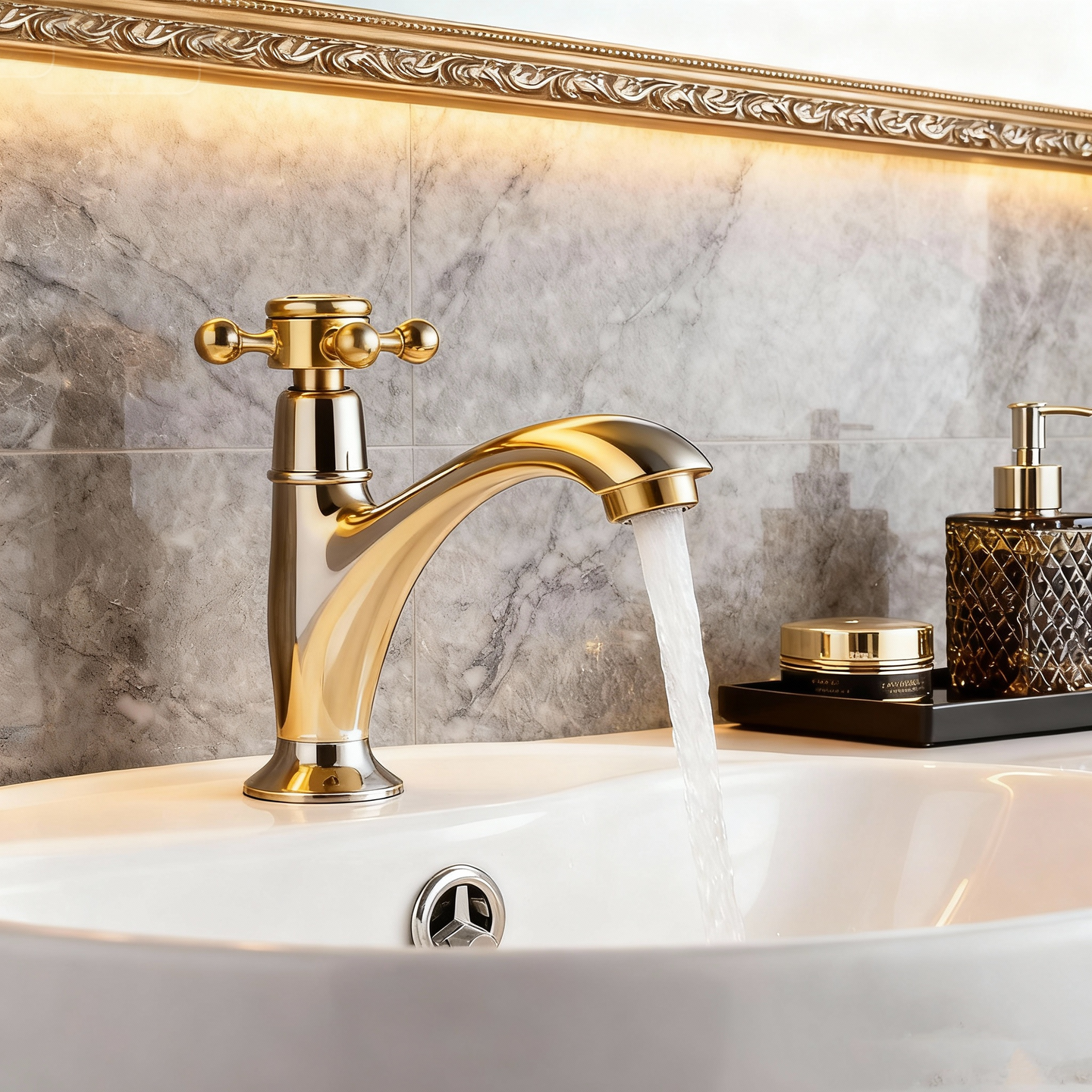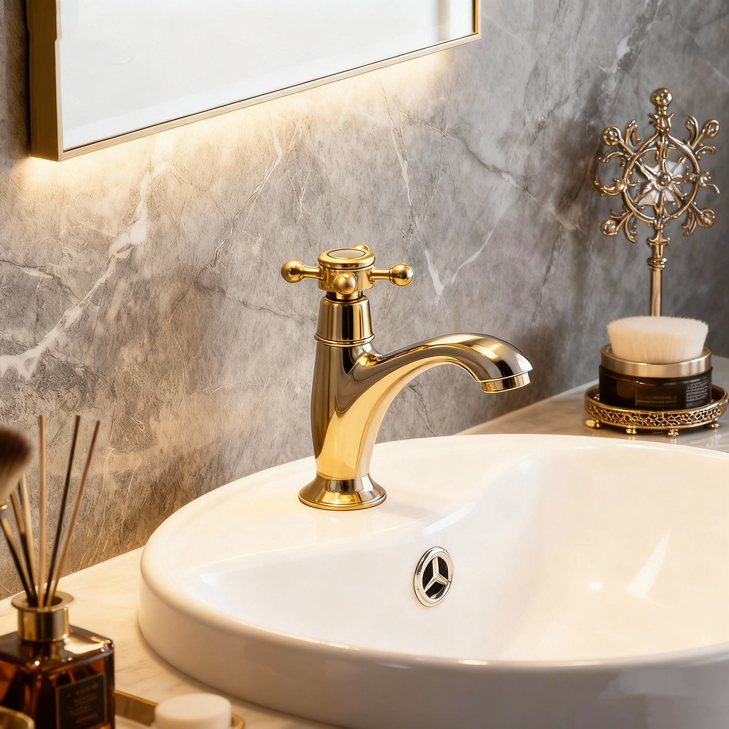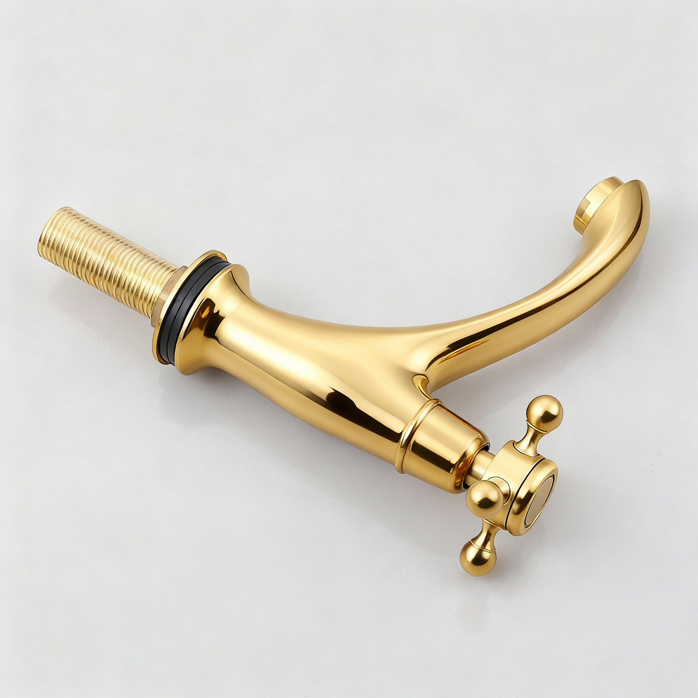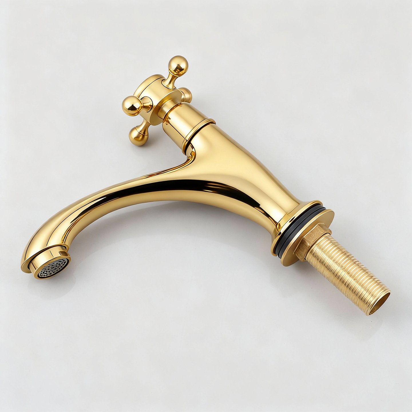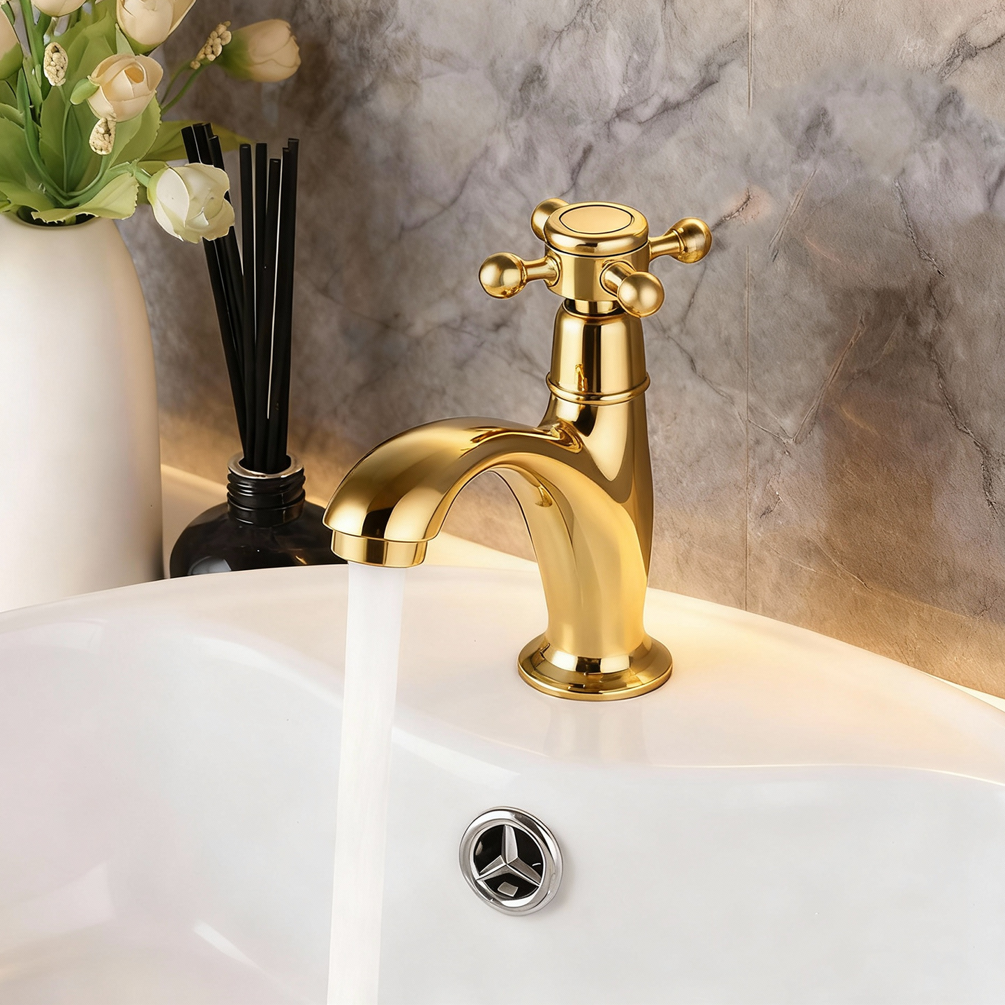 Deze stijlvolle nostalgische koudwaterkraan met luxe gouden afwerking past perfect in klassieke, landelijke en premium badkamers. De verfijnde details en de kruisgreepbediening geven een tijdloze charme en een hoogwaardige uitstraling.