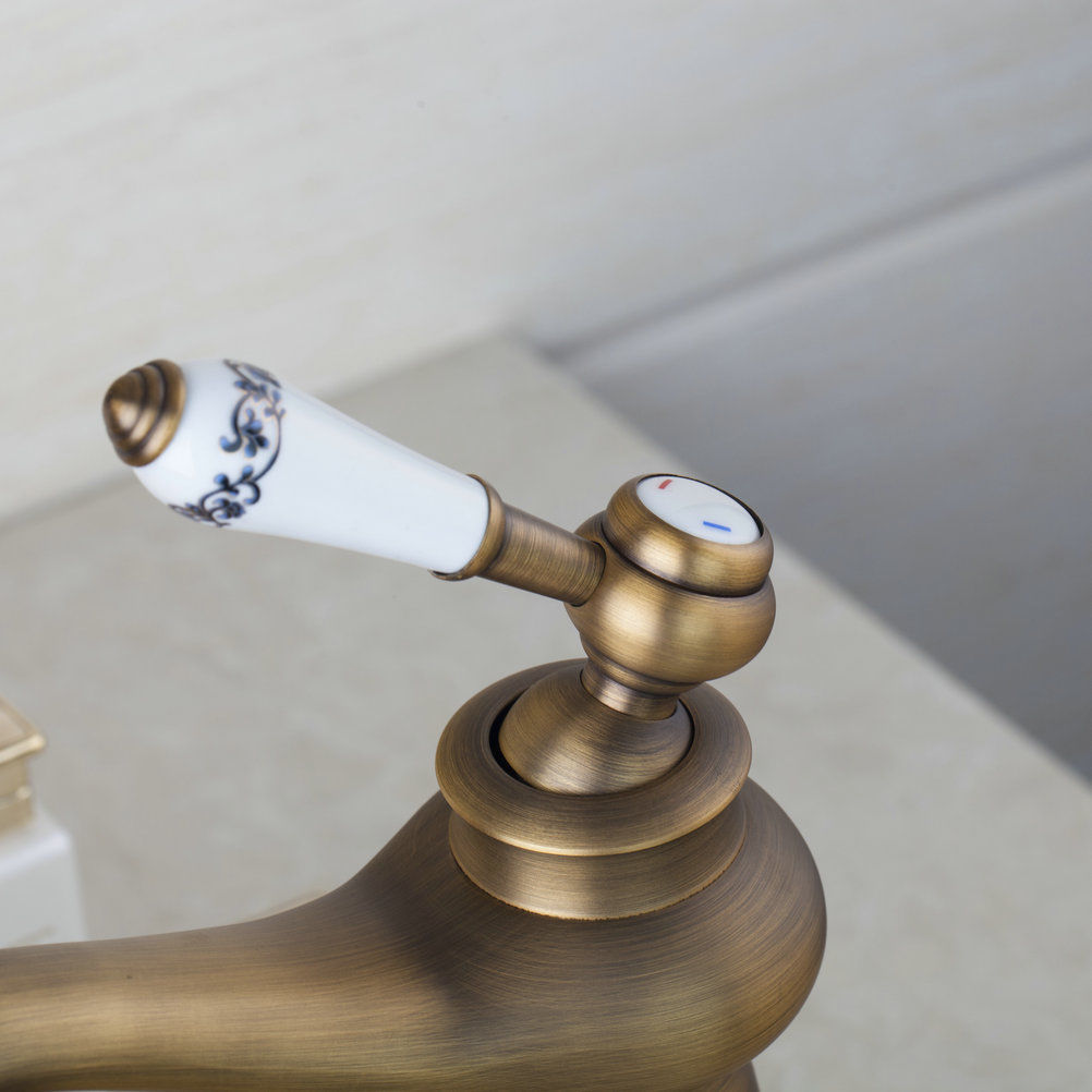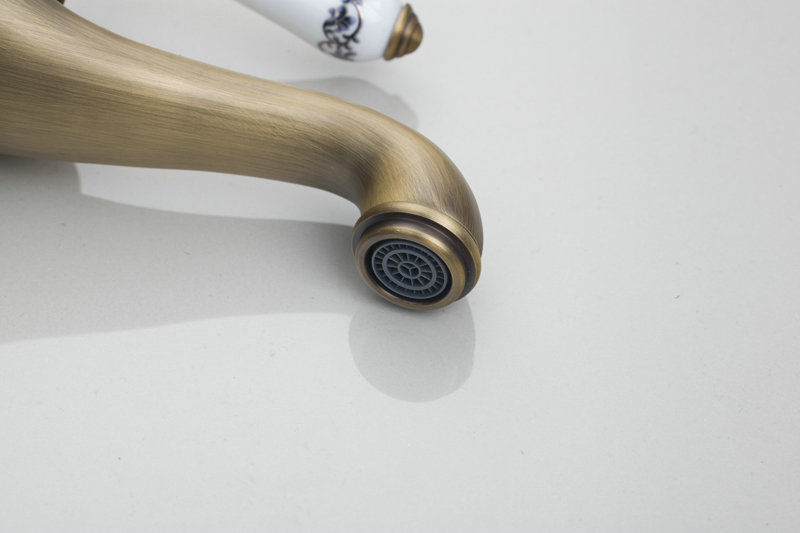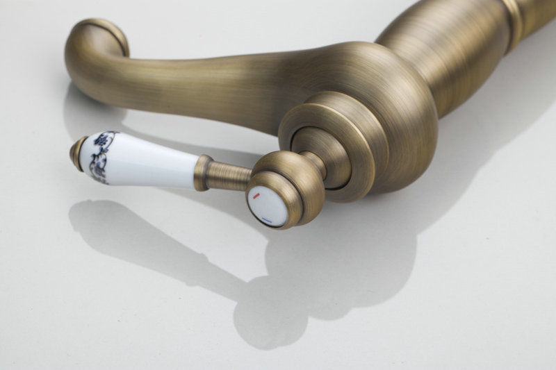 Mooie nostalgische wastafelkraan welke bronskleurig is en witte keramiek elementen bevat: